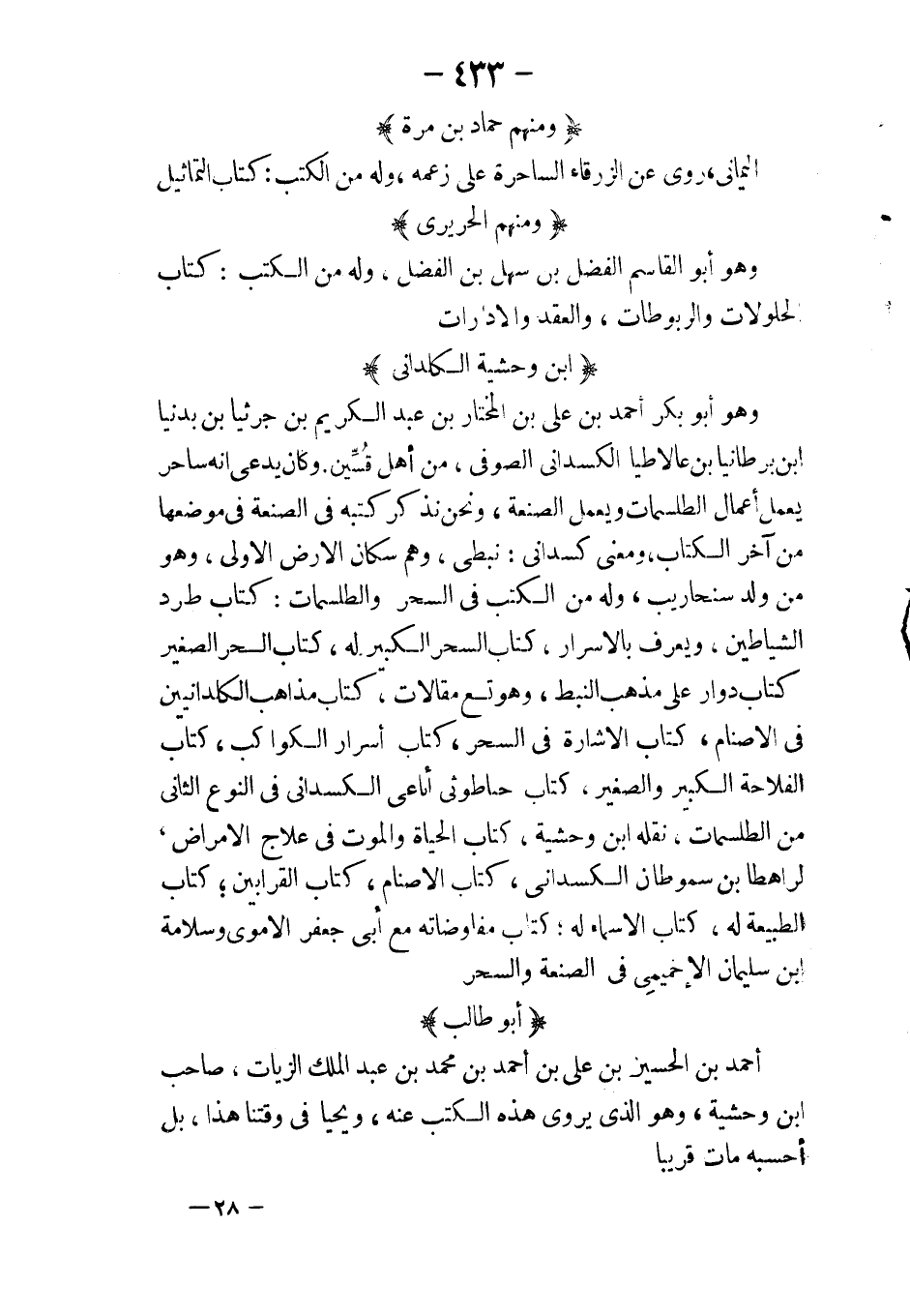 وهم هرمس أغاذيمون انطوس ملينوس أفلاطن ذيسموس اسطوس ديمقراط اسطانس هرقل بوروس مارية دساورس افراغسوس اسطفانس اسكندروروس كيماس جاماسب دراسطوس ارخلاوس مرقونس سنقحا سيماس روستم فورس سعورس ديلاوس مويالس سفيدس مهدارس فرناوانس مسطيوس كاهنرطى آرس القس خالد بن يزيد اصطفن حربي جابر بن حيان يحيى بن خالد بن برمك خاطف الهندي الافرنجي ذو النون المصري سالم بن فروح أبو عيسى الأعور الحسن بن قدامة أبو قران البوني سجادة الرازي السايح العلوي بن وحشية العزاقري هؤلاء المذكورون بعمل الرأس والاكسير التام وبعد هؤلاء ممن طلب هذا الأمر فقصر به العجز فحصل على الأعمال البرانية وهو كثير ونحن نذكر بعضهم في موضعه إن