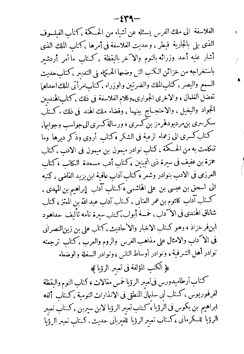 ابن وحشية: أبو بكر احمد بن علي بن قيس بن المختار بن عبد الكريم بن حرثيا بن بدنيا بن بوراطيا الكرداني من أهل جنبلاء وقسين أحد فصحاء النبط بلغة الكسدانيين وقد استقصيت ذكره فيما فعل في المقالة الثامنة في فن السحر والشعبذة والعزائم وقد كان له في ذلك حظ ونحن نذكر في هذا الموضع كتبه في صناعة الكيمياء وهي كتاب الأصول الكبير في الصنعة كتاب الأصول الصغير في الصنعة أيضا كتاب المدرجة كتاب المذاكرات في الصنعة كتاب يحتوي على عشرين كتابا أول وثان وثالث وعلى الولاء نسخة الأقلام التي يكتب بها كتب الصنعة والسحر ذكرها بن وحشية وقرأتها بخطه وقرأت نسخة هذه الأقلام بعينها في جملة أجزاء بخط أبي الحسن بن الكوفي فيها تعليقات لغة ونحو وأخبار وأشعار وآثار وقعت لأبي الحسن بن التنح من كتب بني الفرات وهذا من أظرف ما رأيته بخط بن الكوفي بعد كتاب مساوي العوام لأبي العنبس الصيمري حروف الفاقيطوس اب ت ث ج ح خ د ذ ر ز س ش ص ض ط ظ ع غ ف ق ك ل م ن وهـ لا ي حروف المسند اب ت ث ج ح خ د ذ ر ز س ش ص ض ط ظ ع غ ف ق ك ل م ن وهـ لا ي هذه الحروف التي يصاب العلوم القديمة بها في البرابي حروف العنبث ربما وقعت هذه الخطوط في كتب العلوم التي ذكرتها من الصنعة والسحر والعزائم باللغة التي أحدث أهلها العلم فلا تفهم اللهم ان يكون الإنسان عارفا بتلك اللغة وهذا معوز وربما كانت هذه الكتابات تراجم تؤدي إلى اللغة العربية وينبغي أن يتأمل ويجعل هذه الأقلام مثالا لها ويرجع إليها إن شاء الله تعالى.