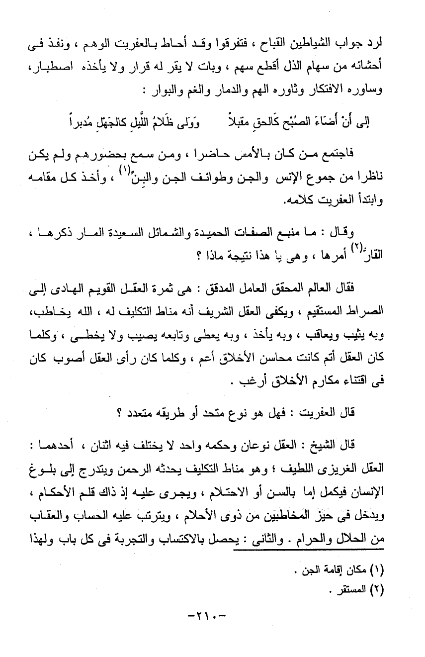 فاجتمع من كان بالأمس حاضراً ومن سمع بحضورهم ولم يكن ناظراً من جموع الأنس والجن وطوائف الجن والبن وأخذ كل مقامه وابتدأ العفريت كلامه وقال ما منبع الصفات الحميدة والشمائل السعيدة المار ذكرها القار أمرها وهي يا هذا نتيجة ماذا؟ فقال العالم المحقق العامل المدقق هي ثمرة العقل القويم الهادي إلى الصراط المستقيم. ويكفي العقل الشريف أنه مناط التكليف له الله يخاطب وبه يثيب ويعاقب وبه يأخذ وبه يعطي وتابعه يصيب ولا يخطي وكلما كان العقل أتم كانت محاسن الأخلاق أعم وكلما كان رأي العقل أصوب كان في اقتناء مكارم الأخلاق أرغب قال العفريت: فهل هو نوع متحد أو طريقة متعدد؟ قال الشيخ: العقل نوعان وحكمه واحد لا يختلف فيه اثنان أحدهما العقل الغريزي اللطيف، وهو مناط التكليف يحدثه الرحمن ويتدرج إلى بلوغ الإنسان فيكمل أما بالسن أو الاحتلام، ويجري عليه إذ ذاك قلم الأحكام ويدخل في حيز المخاطبين من ذوي الأحلام ويترتب عليه الحساب والعقاب من الحلال والحرام والثاني يحصل بالاكتساب والتجربة في كل باب ولهذا