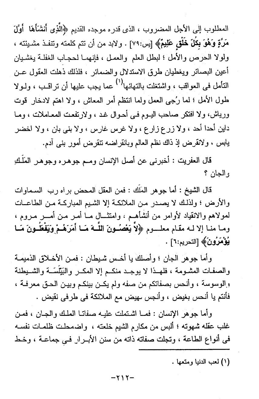 المطلوب إلى الأجل المضروب الذي قدره موجده القديم الذي أنشأه أول مرة وهو بكل خلق عليم ولابد من أن تتم كلمته وتنفذ مشيئته ولولا الحرص والأمل لبطل العلم والعمل فإنهما لحجاب الغفلة يغشيان أعين البصائر ويغطيان طرق الاستدلال والضمائر فلذلك ذهلت العقول عن التأمل في العواقب واستغلت بالتهائها عما يجب عليها أن تراقب ولولا طول الأمل لما رجي العمل ولما انتظم أمر المعاش ولا أهتم لادخار قوت ورياش ولا افتكر صاحب اليوم في أحوال غد ولارتفعت المعاملات وما داين أحد ولا زرع زارع ولا غرس غارس ولا بنى بان ولا اخضر يابس ولانقرض إذ ذاك ظلم العالم وبانقراضه تنقرض أمور بني آدم (قال العفريت) أخبرني عن أصل الإنسان ومم جوهره جوهر الملك والجان (قال) الشيخ أما جوهر الملك فمن العقل المحض براه رب السماوات والأرض ولذلك لا يصدر من الملائكة إلا الشيم المباركة من الطاعات لمولاهم والانقياد لأوامر من أنشاهم وامتثال ما أمر من أمر مروم وما منا إلا له مقام معلوم لا يعصون الله ما أمرهم ويفعلون ما يؤمرون وأما جوهر الجان وأصلك يا أخس شيطان فمن الأخلاق الذميمة والصفات المشومة فلهذا لا يوجد منكم إلا المكر والبيلسة والشيطنة والوسوسة وأنحس بصفاتكم من صفة ولم يكن بينكم وبين الحق معرفة فأنتم يا أنحس بغيض وأنجس نهيض مع الملائكة في طرفي نقيض وأما جوهر الإنسان فما اشتملت عليه صفتا الملك والجان فمن غلب عقله شهوته ألبس من مكارم الشيم خلعته واضمحلت ظلمات نفسه في أنواع الطاعة وتجلت صفات ذاته من سنن الأبرار في جماعة وخط
