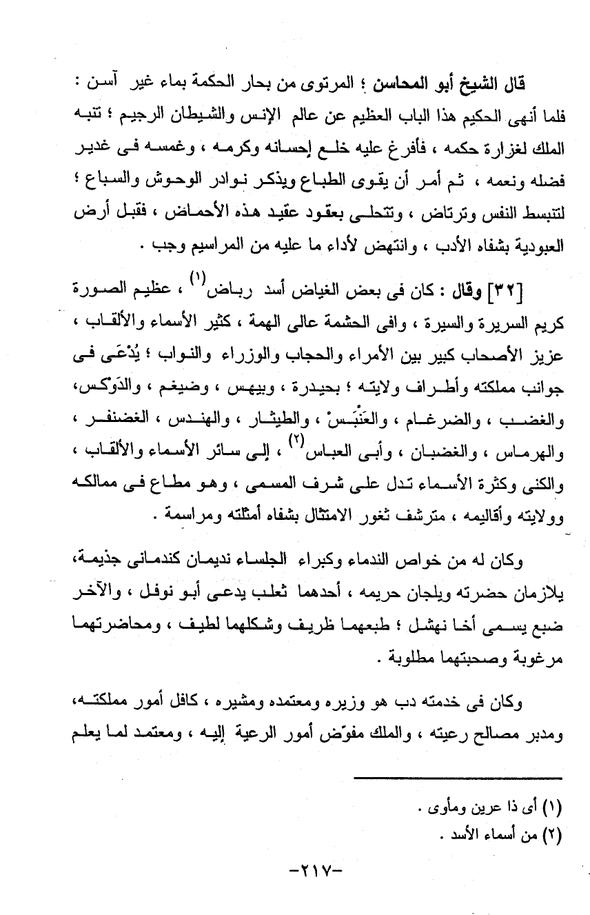 (قال) الشيخ أبو المحاسن المرتوي من بحار الحكمة بماء غير آسن فلما أنهى الحكيم هذا الباب العظيم عن عالم الإنس والشيطان الرجيم تنبه الملك لغزارة حكمه فأفرغ عليه خلع إحسانه وكرمه وغمسه في غدير فضله ونعمه ثم أمر أن يقوي الطباع ويذكر نوادر الوحوش والسباع لتنبسط النفس وترتاض وتتحلى بعقود عقيدة هذه الأحماض فقبل أرض العبودية بشفاه الأدب وانتهض لأداء ما عليه من المراسيم وجب وقال كان في بعض الغياض أسد رباض عظيم الصورة كريم السريرة والسيرة وافي الحشمة عالي الهمة كثير الأسماء والألقاب عزيز الأصحاب كبير بين الأمراء والحجاب والوزراء والنواب يدعى في جوانب مملكته وأطراف ولايته بحيدرة وبيهس والدوكس والغضب والضرغام والعنبس والطيشار والهندس الغضنفر والهرماس والغضبان وأبي العباس إلى سائر الأسماء والألقاب والكنى وكثرة الأسماء تدل على شرف المسمى وهو مطاع في مماليكه وولاياته وأقاليمه مترشف ثغور الامتثال بشفاه أمثلته ومراسيمه، وكان له ومن خواص الندماء وكبراء الجلساء نديمان كندماني جذيمة يلازمان حضرته ويلجان حريمه أحدهما ثعلب يدعى أبا نوفل والآخر ضبع يسمى أخا نهشل، طبعهما ظريف وشكلهما لطيف ومحاضرتهما مرغوبة وصحبتهما مطلوبة.