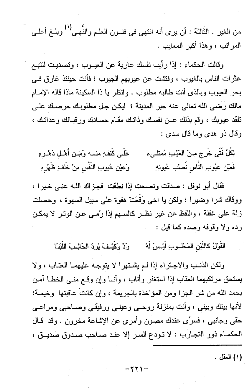 من الغير الثالثة أن يرى أنه انتهى في فنون العلم والنهى وبلغ أعلى المراتب وهذا أكبر المعايب وقالت الحكماء إذا رأيت نفسك عارية عن العيوب وتصديت لتتبع عثرات الناس بالغيوب وفتشت عن عيوبهم الجيوب فأنت حينئذ غارق في بحر العيوب وبالذي أنت طالبه مطلوب وانظر يا ذا السكينة ماذا قاله الإمام مالك رضي الله تعالى عنه حبر المدينة ليكن جل مطلوبك حرصك على تفقد عيوبك وقم بذلك عن نفسك وذاتك مقام حسادك ورقبائك وعداتك وقال ذو هدى وقال سدى: