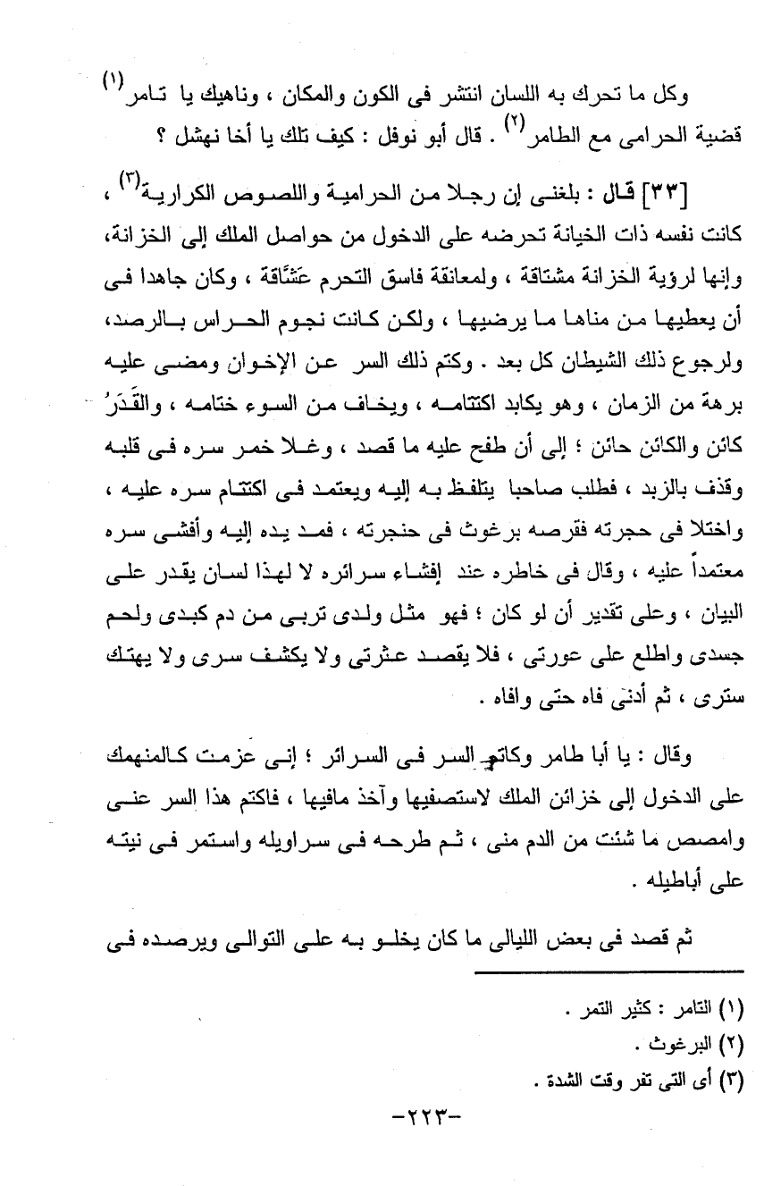 وكل ما تحرك به اللسان انتشر في الكون والمكان وناهيك يا تامر قضية الحرامي مع الطامر قال أبو نوفل: كيف تلك يا أخا نهشل (قال) بلغني إن رجلاً من الحرامية واللصوص الكرارية كانت نفسه ذات الخيانة تحرضه على الدخول من حواصل الملك إلى الخزانة وإنها رؤية الخزانة مشتاقة ولمعانقة فاسق التحرم عشاقه وكان جاهداً في أن يعطيها من مناها ما يرضيها ولكن كانت نجوم احراس بالرصد ولرجوع ذلك الشيطان كل بعد وكتم ذلك السر عن الإخوان ومضى عليه برهة من الزمان وهو يكابد اكتتامه ويخاف من السوء ختامه والقدر كائن والكائن حائن إلى أن طفح عليه ما قصد وغلا خمر سره في قلبه وقذف بالزبد فطلب صاحباً يتلفظ به إليه ويعتمد في اكتتام سره عليه واختلافي حجرته فقرصه برغوث في حنجرته فمد يده إليه وأفشى سره معتمداً عليه وقال في خاطره عند إفشاء سرائره لا لهذا لسان يقدر على البيان وعلى تقدير أن لو كان فهو مثل ولدي تربى من دم كبدي ولحم جسدي واطلع على عورتي فلا يقصد عترتي ولا يكشف سري ولا يهتك ستري ثم أدنى فاه حتى وافاه وقال يا أبا طامر وكاتم السر في السرائر إني عزمت كالمنهمك على الدخول إلى خزائن الملك لأستصفيها وآخذ ما فيها فاكتم هذا السر عني وامصص ما شئت من الدم مني ثم طرحه في سراويله واستمر في نيته على أباطيله ثم قصد في بعض الليالي ما كان يخلو به على التوالي ويرصده في