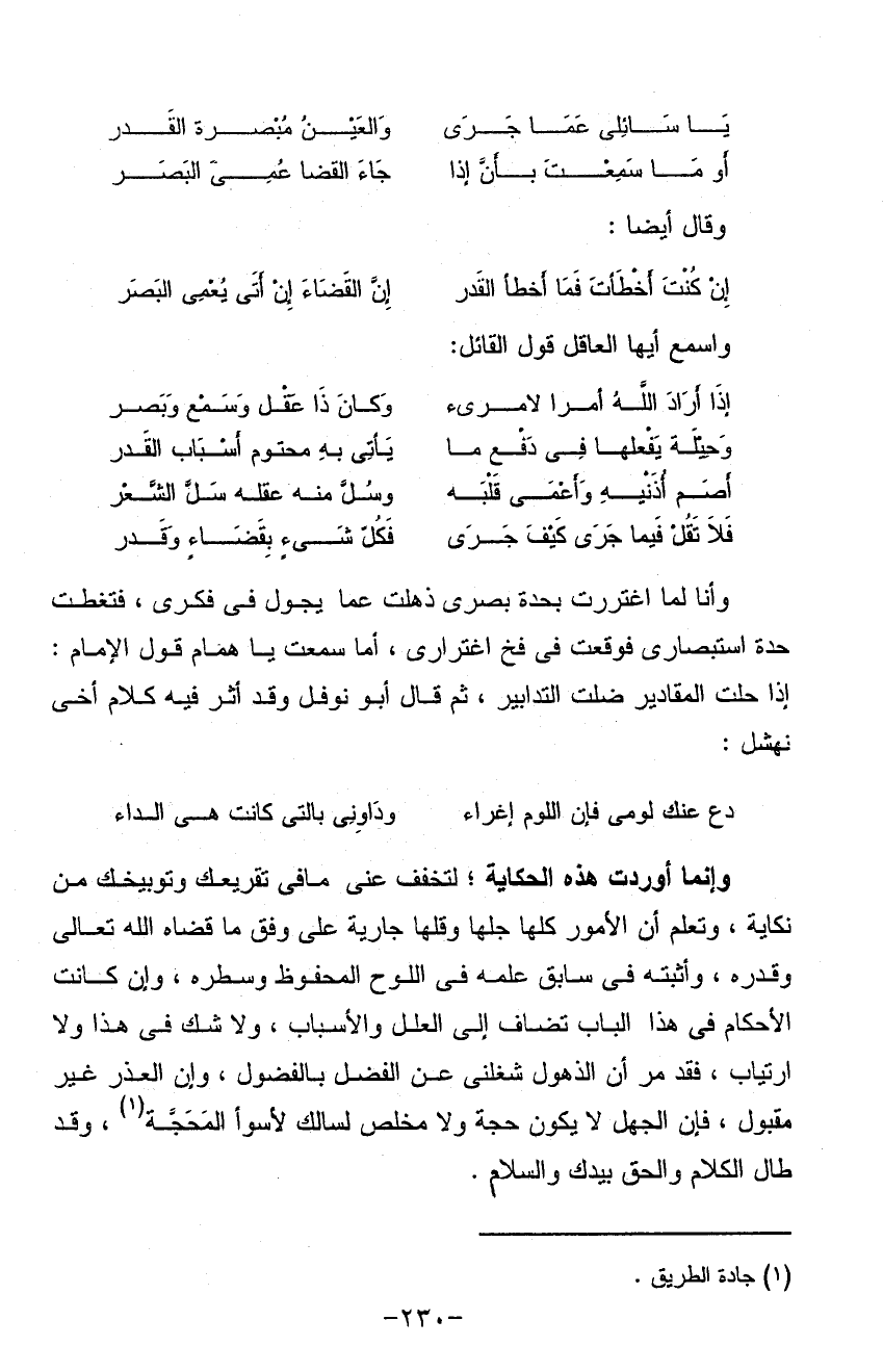 وإنما أوردت هذه الحكاية لتخفف عني ما في تقريعك وتوبيخك من نكاية وتعلم إن الأمور كلها جلها وقلها جارية على وفق ما قضاه الله تعالى وقدره وأثبته في سابق عمله في اللوح المحفوظ وسطره وإن كانت الأحكام في هذا الباب تضاف إلى العلل والأسباب ولا شك في هذا ولا ارتياب فقد مر أن الذهول شغلني عن الفضل بالفضول وإن العذر غير مقبول فإن الجهل لا يكون حجة ولا مخلص لسالك لا سوأ المحجة وقد طال الكلام والحق بيدك والسلام