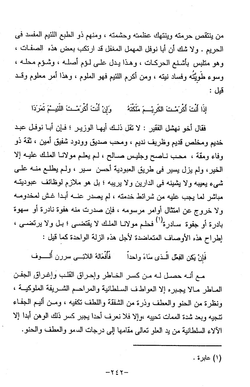 فقال أخو نهشل الفقير لا تقل ذلك أيها الوزير فإن أبا نوفل عبد خديم ومخلص قديم وظريف نديم ومحب صديق وودود شفيق أمين ثقة ذو وفاء ومقه محب ناصح وجليس صالح لم يعلم مولانا الملك عليه إلا الخير ولم يزل يسير في طريق العبودية أحسن سير ولم يطلع منه على شيء يعينه ولا يشينه في الدارين ولا يريبه بل هو ملازم لوظائف عبوديته مباشر لما يجب عليه من شرائط خدمته لم يصدر أبدا غش لمخدومه ولا خروج عن امتثال أوامر مرسومه فإن منه هفوة نادرة أو سهوة بادره أو جفوة سادره فحلم مولانا الملك لا يقتضي بل ولا يرتضي إطراح هذه الأوصاف المتعاضد لأجل هذه الزلة الواحدة كما قيل: