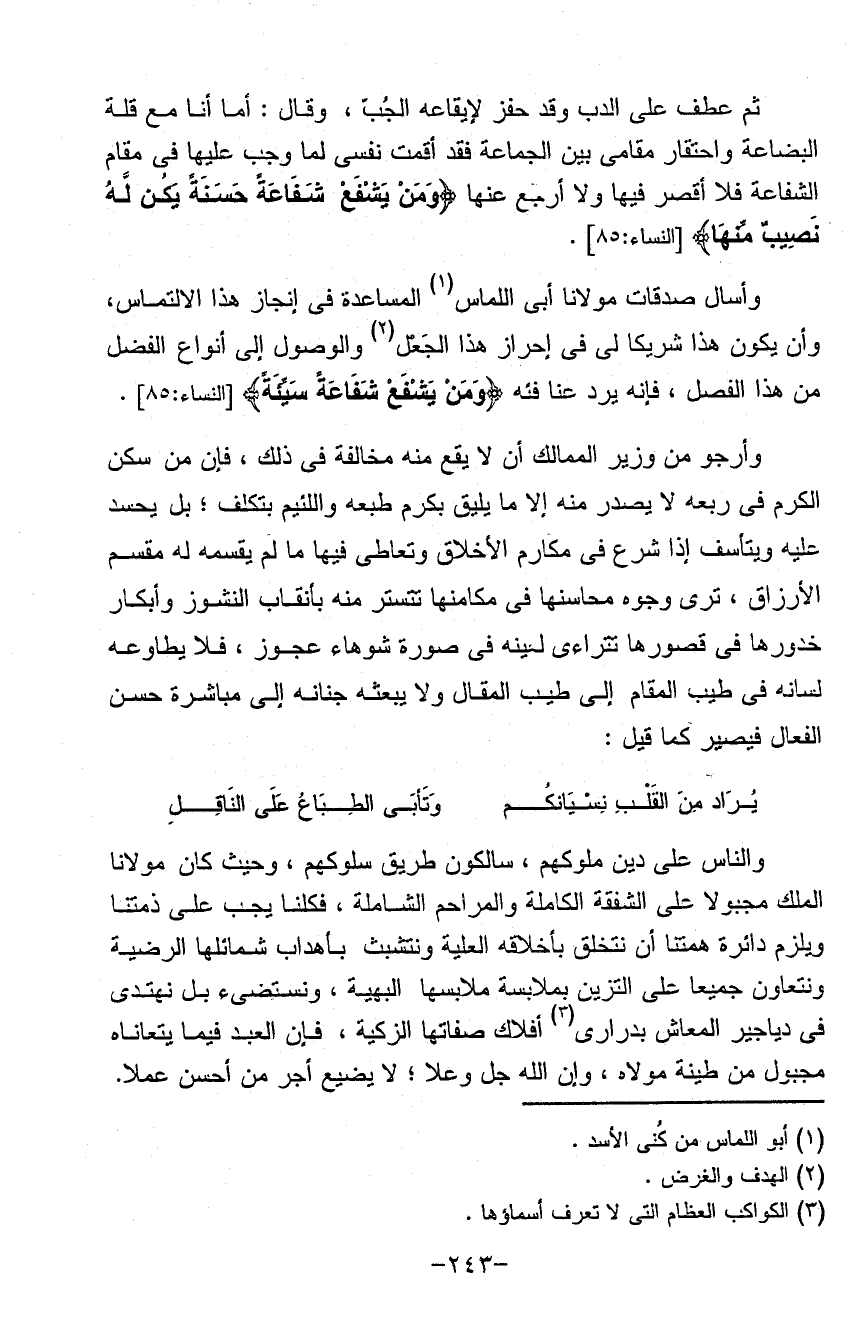 والناس على دين ملوكهم سالكون طريق سلوكهم وحيث كان مولانا الملك مجبولاً على الشفقة الكاملة والمراحم الشاملة فكلنا يجب على ذمتنا ويلزم دائرة همتنا أن نتخلق بإخلافه العلية ونتشبث بأهداب شمائلها الرضية ونتعاون جميعاً على التزين بملابسة ملابسها البهية ونستضيء بل نهتدي في دياجير المعاش بدراري أفلاك صفاتها الزكية فإن العبد فيما يتعاناه مجبول من طينة مولاه وإن الله جل وعلا لا يضيع أجر من أحسن عملاً