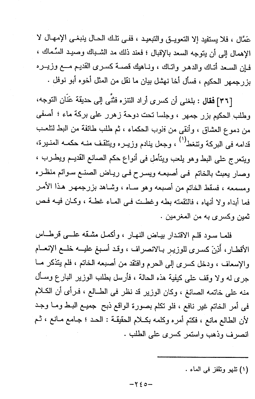 عمال فلا يستفيد إلا التعويق والتبعيد ففي تلك الحال ينبغي الإمهال لا الإهمال إلى أن يتوجه السعد بالإقبال فعند ذلك مد الشباك وصيد السماك فإن السعد أتاك والدهر واتاك وناهيك قصة كسرى القديم مع وزيره بزرجمهر الحكيم فسأل أخا نهشل بيان ما نقل من المثل أخوه أبو نوفل (فقال) بلغني أن كسرى أراد التنزه فثنى إلى حديقة عنان التوجه وطلب الحكيم بزرجمهر وجلسا تحت دوحة زهر على بركة ماء أصفى من دموع العشاق وأنقى من قلوب الحكماء ثم طلب طائفة من البط لتلعب قدامه في البركة وتنغط وجعل ينادم وزيره ويتلقف منه حكمه المنيره ويتعرج على البط وهو يلعب ويتأمل في أنواع حكم الصانع الخاتم من أصبعه وهو ساه وشاهد بزرجمهر هذا الأمر فما أبداه ولا أنهاه فالتقمته بطة وغطت في الماء غطة وكان فيه فص ثمين وكسرى به من المغرمين فلما سود قلم الاقتدار بياض النهار وأكمل مشقة على قرطاس الأقطار أذن كسرى للوزير بالانصراف وقد أسبغ عليه خلع الأنعام والإسعاف ودخل كسرى إلى الحرم وافتقد من أصبعه الخاتم فلم يتذكر ما جرى له ولا وقف على كيفية هذه الحالة فأرسل يطلب الوزير البارع وسأل منه عن خاتمة الصائغ وكان الوزير قد نظر في الطالع فرأى أن الكلام فيأمر الخاتم غير نافع فلو تكلم بصورة الواقع ذبح جميع البط وما وجد لأن الطالع مانع فكتم أمره وكلمه بكلام الحقيقة الحد جامع مانع ثم أنصرف وذهب واستمر كسرى على الطلب