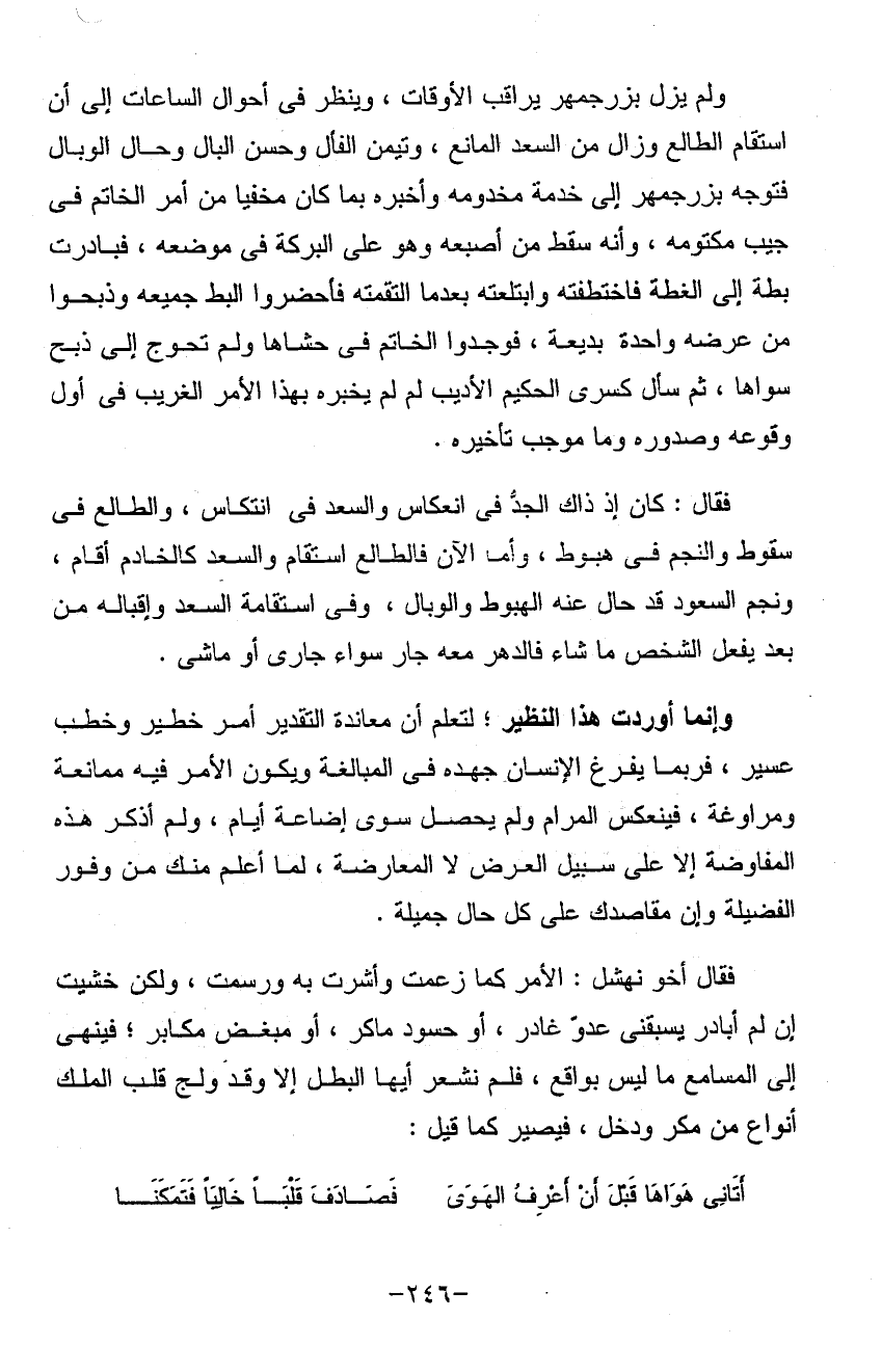 ولم يزل بزرجمهر يراقب الأوقات وينظر في أحوال الساعات إلى أن استقام الطالع وزال من السعد المانع وتيمن الفال وحسن البال وحال الوبال فتوجه بزرجمهر إلى خدمة مخدومه وأخبره بما كان مخفياً من أمر الخاتم في جيب مكتومه وأنه سقط من أصبعه وهو على البركة في موضعه فبادرت بطة إلى الغطة فاختطفته وابتلعته بعد ما التقمته فأحضروا البط جميعه وذبحوا من عرضة واحدة بديعة فوجدوا الخاتم في حشاها ولم تحوج إلى ذبح سواها ثم سأل كسرى الحكيم الأديب لمَ لم يخبره بهذا الأمر الغريب في أول وقوعه وصدوره وما موجب تأخيره فقال: كان إذ ذاك الجد في انعكاس والسعد في انتكاس والطالع في سقوط والنجم في هبوط وأما الآن فالطالع واستقام والسعد كالخادم أقام ونجم السعود قد حال عنه الهبوط والوبال وفي استقامة السعد وإقباله من بعد يفعل الشخص ما شا فالدهر معه جار سواء جاري أو ماشي (وإنما أوردت) هذا النظير لتعلم أن معاندة التقدير أمر خطير وخطب عسير فربما يفرغ الإنسان جهده في المبالغة ويكون الأمر فيه ممانعة ومراودة فينعكس المرام ولم يحصل سوى إضاعة أيام ولم أذكر هذه المفاوضة إلا على سبيل العرض لا المعارضة لما علم منك من وفور الفضيلة وإن مقاصدك على كل حال جميلة فقال أخو نهشل الأمر كما زعمت وأشرت به ورسمت ولكن خشيت أن لم أبادر يسبقني عدوة غادر أو حسود ماكر أو مبغض مكابر فينهى المسامع ما ليس بواقع فلم نشعر أيها البطل إلا وقد ولج قلب الملك أنواع من مكر ودخل فيصير كما قيل:
