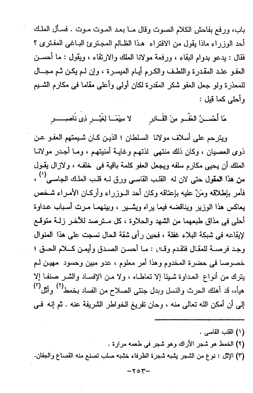 ويترجم على أسلاف مولانا السلطان الذين كان شيمتهم العفو عن ذوي العصيان وكان ذلك منتهى لذتهم وغاية أمنيتهم وما أجدر مولانا الملك أن يحيي مكارم سلفه ويجعل العفو كلمة باقية في خلفه ولا زال يقول من هذا المقول حتى لان له القلب القاسي ورق له قلب الملك الجاسي فأمر بإطلاقه ومن عليه بإعتاقه وكان أحد الوزراء وأركان الأمراء شخص يعاكس هذا الوزير ويناقضه فيما يراه ويشير وبينهما مرت أسباب عداوة أحلى في مذاق طبعهما من الشهد والحلاوة كل مترصد للآخر زلة متوقع لإيقاعه في شبكة البلاء غفلة فحين رأى شقة الحال نسجت على هذا المنوال وجد فرصة للمقال فتقدم وقال ما أحسن الصدق وأيمن كلام الحق خصوصاً في حضرة المخدوم وهذا أمر معلوم عدو مبين وحسود مهين لم يترك من أنواع العداوة شيئاً إلا تعاطاه ولا من الإفساد والشر صنفاً إلا هياه قد أهلك الحرث والنسل وبدل جنتي الصلاح من الفساد بخمط وأثل إلى أن أمكن الله تعالى منه وحان تفريغ الخواطر الشريفة عنه ثم أنه في