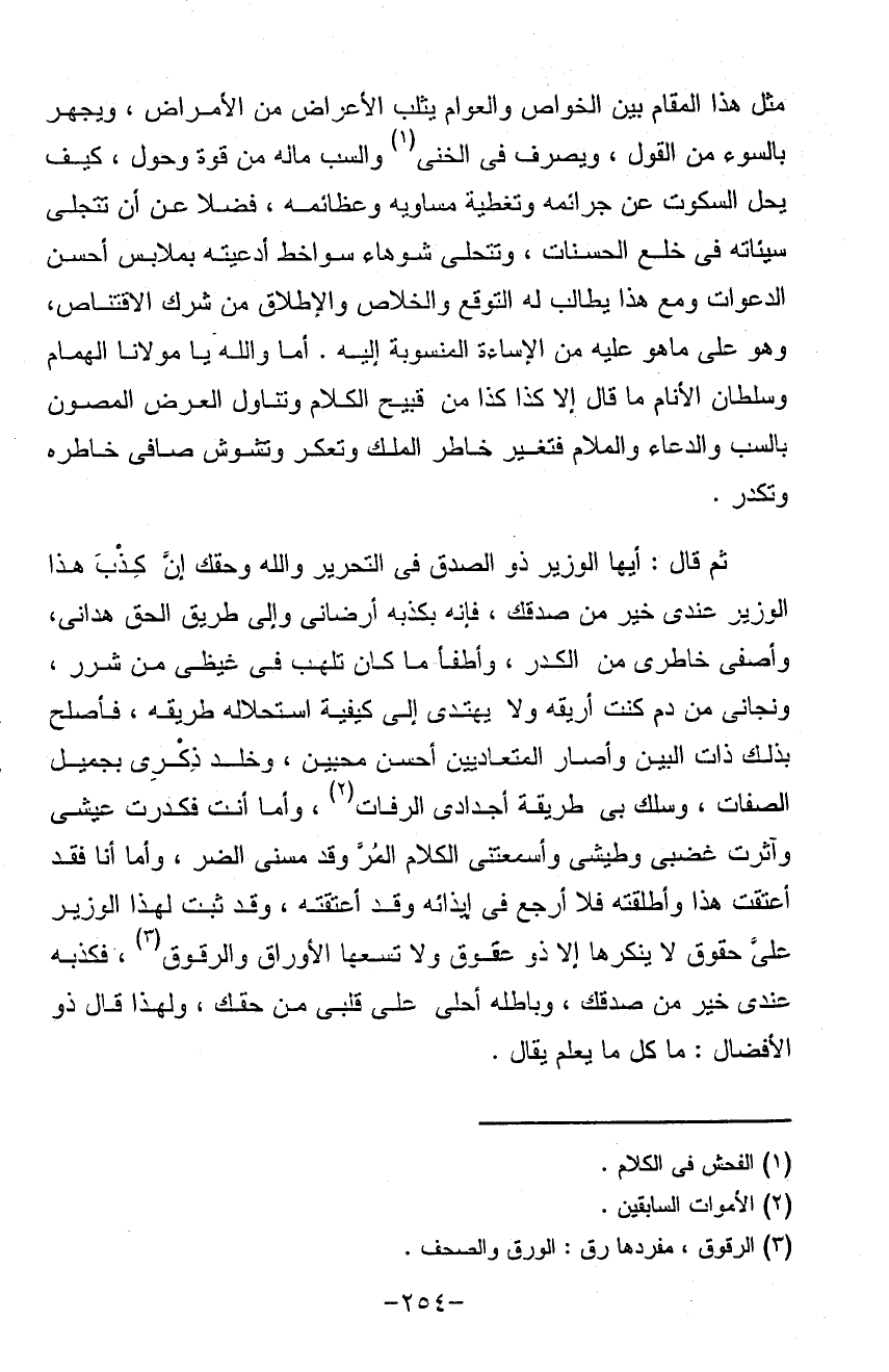 مثل هذا المقام بين الخواص والعوام يثلب الأعراض من الأمراض ويجهر بالسوء من القول ويصرف في الخنى والسب ما له من قوة وحول كيف يحل السكوت عن جرائمه وتغطية مساويه وعظائمه فضلاً عن أن تتجلى سيئاته في خلع الحسنات وتتحلى شوهاء سواخط أدعيته بملابس أحسن الدعوات ومع هذا يطلب له التوقع والخلاص والإطلاق من شرك الاقتناص وهو على ما هو عليه من الإساءة المنسوبة إليه أما والله يا مولانا الهمام وسلطان الأنام ما قال إلا كذا كذا من قبيح الكلام وتناول العرض المصون بالسب والدعاء والملام فتغير خاطر الملك وتعكر وتشوش صافي خاطره وتكدر ثم قال أيها الوزير ذو الصدق في التحرير والله وحقك إن كذب هذا الوزير عندي خير من صدقك فإنه بكذبه أرضاني وإلى طريق الحق هداني وأصفى خاطري من الكدر وأطغا ما كان تلهب في غيظي من شرر ونجاني من دم كنت أريقه ولا يهتدي إلى كيفية استحلاله طريقة فأصلح بذلك ذات البين وأصار المتعادلين أحسن محبين وخلد ذكري بجميل الصفات وسلك بي طريقة أجدادي الرفات وأما أنت فكدرت عيشي وآثرت غضبي وطيشي وأسمعتني الكلام المر وقد سنى منك الضر وأما أنا فقد أعتقت هذا وأطلقته فلا أرجع في إيذائه وقد أعتقته وقد ثبت لهذا الوزير على حقوق لا ينكرها إلا ذو عقوق ولا تسعها الأوراق والرقوق فكذبه عندي خير من صدقك وباطله أحلى على قلبي من حقك ولهذا قال ذو الأفضال ما كل ما يعلم يقال