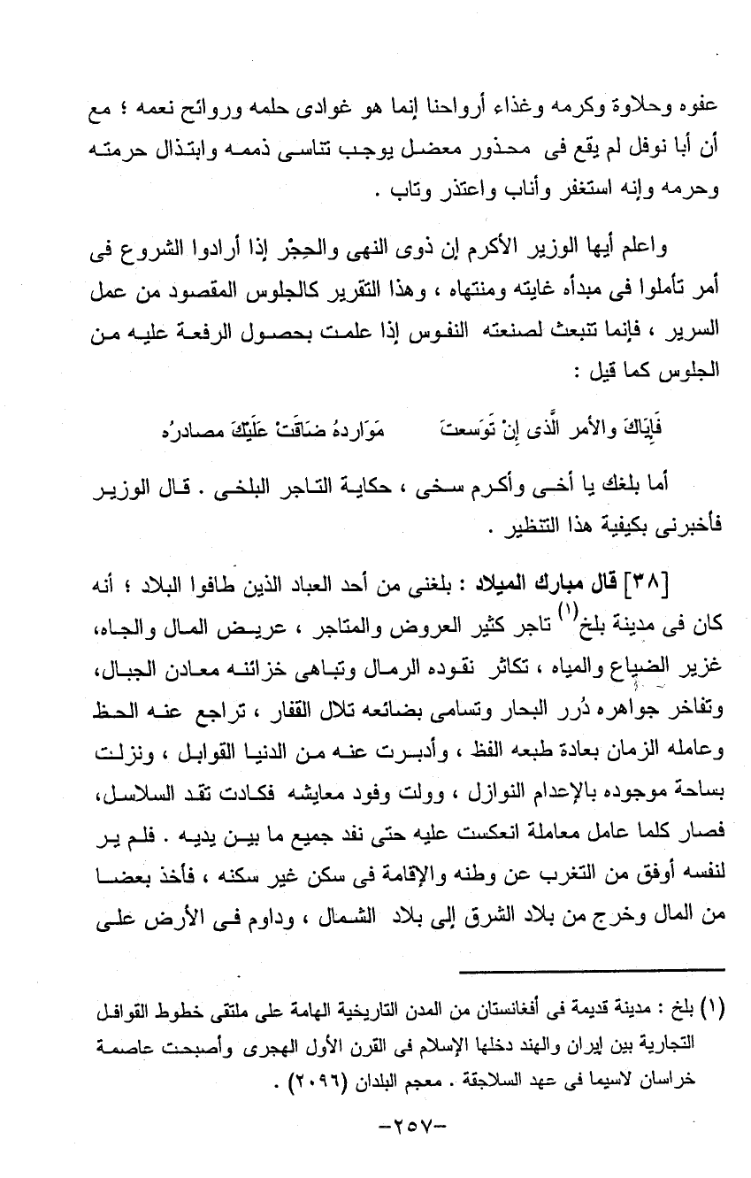 أما بلغك يا أخي وأكرم سخي حكاية التاجر البلخي؟ قال الوزير: أخبرني بكيفية هذا التنظير! (قال) مبارك الميلاد بلغني من أحد العباد الذين طافوا البلاد أنه كان في مدينة بلخ تاجر كثير العروض والمتاجر عريض المال والجاه غزير الضياع والمياه تكاثر نقوده الرمال وتباهي خزائنه معادن الجبال وتفاخر جواهره در البحار وتسامي بضائعه تلال القفار تراجع عنه الحظ وعامله الزمان بعادة طبعه الفظ وأدبرت عنه من الدنيا القوابل ونزلت بساحة موجوده بالإعدام النوازل وولت وفود معايشه فكادت تقد السلاسل فصار كلما عامل معاملة انعكست عليه حتى نفد جميع ما بين يديه فلم ير لنفسه أوفق من التغرب عن وطنه والإقامة في سكن غير سكنه فأخذ بعضاً من المال وخرج من بلاد الشرق إلى بلاد الشمال وداوم في الأرض على