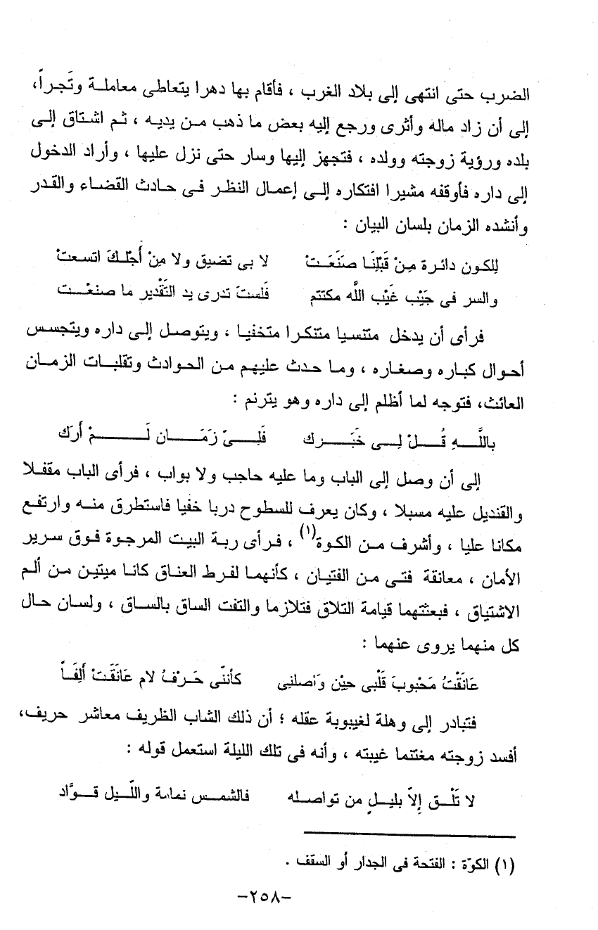 إلى أن وصل إلى الباب وما عليه حاجب ولا بواب فرأى الباب مقفلاً والقنديل عليه مسبلاً وكان يعرف للسطوح درباً خفياً فاستطرق منه وارتفع مكاناً علياً وأشرف من اكوة فرأى ربة البيت المرجوة فوق سرير الأمان معانقة فتى من الفتيان كأنهما لفرط العناق كانا ميتين من ألم الاشتياق فبعثتهما قيامة التلاق فتلازما والتفت الساق بالساق ولسان حال كل منها يروي عنهما: