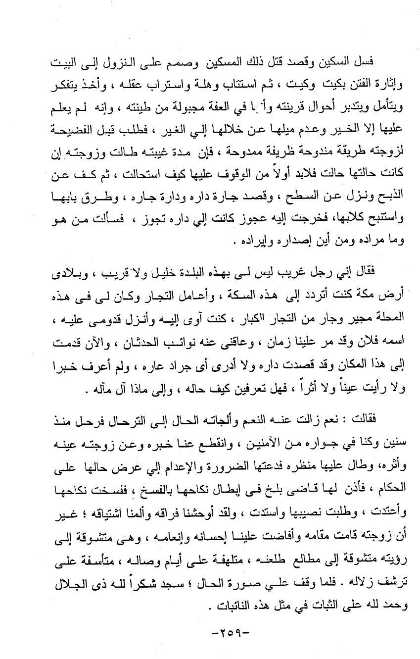 فسل السكين وقصد قتل ذلك المسكين وصمم على النزول إلى البيت وإثارة الفتن بكيت وكيت ثم استناب وهله واستراب عقله وأخذ يتفكر ويتأمل ويتدبر واحتضر أحوال قرينته وأنها في العفة مجبولة من طينته وأنه لم يعلم عليها إلا الخير وعدم ميلها عن حلالها إلى الغير فطلب قبل الفضيحة لزوجته طريقة مندوحة ظريفة ممدوحة فإن مدة غيبته طالت وزوجته إن كانت حالتها حالت فلابد أولاً من الوقوف عليها كيف استحالت ثم كف عن الذبح ونزل عن السطح وقصد جارة داره ودارة جارة وطرق بابها واستنبح كلابها فخرجت إليه عجوز كانت إلى داره تجوز فسألت من هو وما مراده ومن أين إصداره وإيراده فقال: إني رجل غريب ليس لي بهذه البلدة خليل ولا قريب وبلادي أرض مكة كنت أتردد هذه السكة وأعامل التجار وكان لي في هذه المحلة مجير وجار من التجار الكبار كنت آوي إليه وأنزل في قدومي عليه اسمه فلان وقد مر علينا زمان وعاقني عنه نوائب الحدثان والآن قدمت إلى هذا المكان وقد قصدت داره ولا أدري أي جراه عاره ولم أعرف له خبراً ولا رأيت عيناً ولا أثراً فهل تعرفين كيف حاله وإلى ماذا آل مآله؟ فقال: نعم. زالت عنه النعم وألجأته الحال إلى الترحال فرحل منذ سنين وكنا في جواره من الآمنين وانقطع عنا خبره وعن زوجته عينه وأثره وطال عليها منظره ففسخت نكاحها واعتدت وطلبت تصيبها واستدت ولقد أوحشنا فرقاه وآلمنا اشتياقه غير أن زوجته قامت مقامه وأفاضت علينا إحسانه وإنعامه وهي متشوقة إلى رؤيته متشوفة إلى مطالع طلعته متلهفة على أيام وصاله متأسفة على ترشف زلاله فلما وقف على صورة الحال سجد شكر الله ذي الجلال وحمد الله على الثبات في مثل هذه النائبات