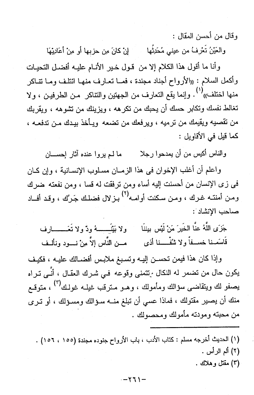 وأنا أقول هذا الكلام إلا من قول خير الأنام عليه أفضل التحيات وأكمل السلام أرواح أجناد مجندة فما تعارف منها ائتلف وما تناكر منها اختلف وإنما يقع التعارف من الجهتين والتناكر من الطرفين ولا تغالط نفسك وتكابر حسك أن يحيك من تكرهه ويزينك من تشوهه ويقربك من تقصيه ويقيمك من ترميه ويرفعك من تضعه ويأخذ بيدك من تدفعه كما قيل في الأقاويل: