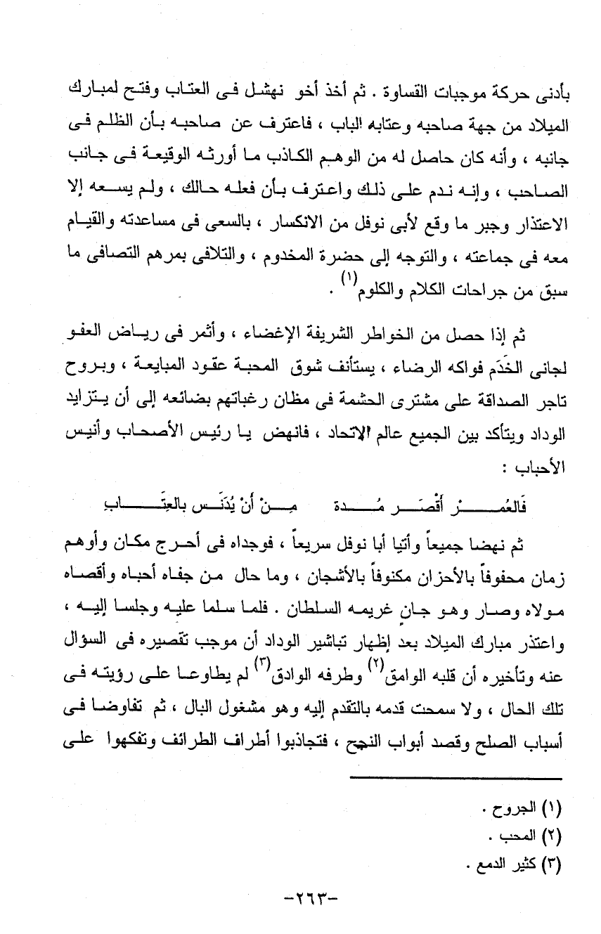 بأدني حركة موجبات القساوة ثم أخذ أخو نهشل في العتاب وفتح لمبارك الميلاد من جهة صاحبه وعتابه الباب فاعترف بإن فعله حالك ولم يسعه إلا الاعتذار وجبر ما وقع لأبي نوفل من الإنكار بالسعي في مساعدته والقيام معهفي جماعته والتوجه إلى حضرة المخدوم والتلافي بمرهم التصافي ما سبق من جراحات الكلام والكلوم ثم إذا حصل من الخواطر الشريفة الإغضا وأثمر في رياض العفو لجاني الخدم فواكه الرضا يستأنف شوق المحبة عقود المبايعة ويروج تاجر الصداقة على مشترى الحشمة في مظان رغباتها بضائعه إلى أن يتزايد الوداد ويتأكد بين الجميع عالم الاتحاد فانهض يا رئيس الأصحاب وأنيس الأحباب: