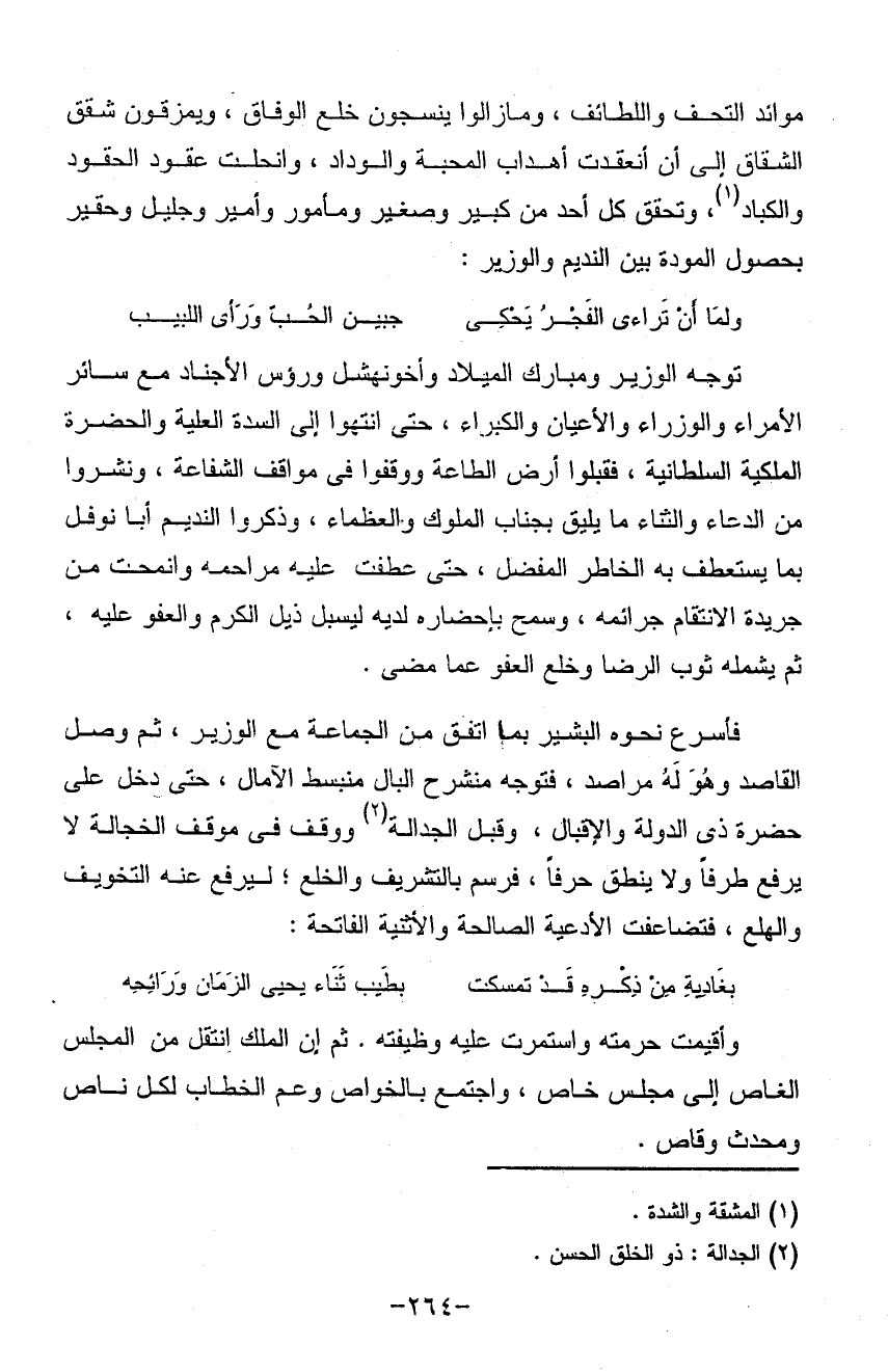 توجه الوزير ومبارك الميلاد وأخو نهشل ورؤوس الأجناد مع سائر الأمراء والوزراء والأعيان والكبراء حتى انتهوا إلى السدة العلية والحضرة الملكية السلطانية فقبلوا أرض الطاعة ووقفوا في مواقف الشفاعة ونشروا من الدعاء والثناء ما يليق بجناب الملوك والعظماء وذكروا النديم أبا نوفل بما يستعطف به الخاطر المفضل حتى عطفت عليه مراحمه وانمحت من جريدة لانتقام جرائمه وسمح بإحضاره لديه ليسبل ذيل الكرم والعفو عليه ثم يشمله ثوب الرضا وخلع العفو عما مضى فأسرع نحوه البشير بما اتفق من الجماعة مع الوزير ثم وصل القاصد وهو له مراصد فتوجه منشرح البال منبسط الآمال حتى دخل على حضرة ذي الدولة والإقبال وقبل الجدالة ووقف في موقف الخجالة لا يرفع طرفاً ولا ينطق حرفاً فرسم بالتشريف والخلع ليرفع عنه التخويف والهلع فتضاعفت الأدعية الصالحة والأثنية الفائحة: