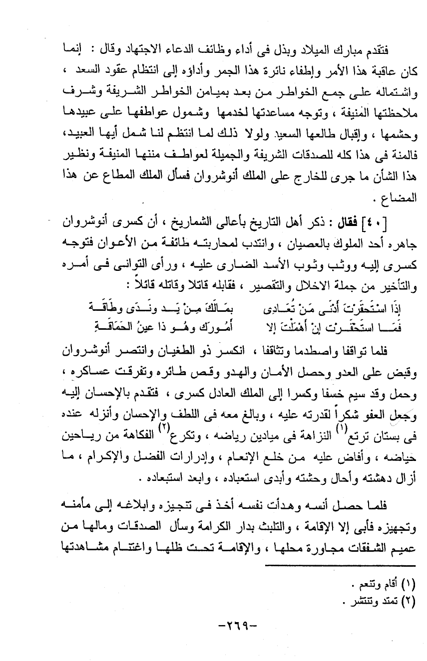 فتقدم مبارك الميلاد وبذل في أداء وظائف الدعاء الاجتهاد وقال إنما كان عاقبة هذا الأمر وإطفاء ناثرة هذا الجمر وأداؤه إلى انتظام عقود السعد واشتماله على جمع الخواطر من بعد بميامن الخواطر الشريفة وشرف ملاحظتها المنيفة وتوجه مساعدتها لخدمها وشمول عواطفها على عبيدها وحشمها وإقبال طالعها السعيد ولولا ذلك لما انتظم لنا شمل أيها العبيد فالمنة في هذا كله للصدقات الشريفة والجميلة لعواطف مننها المنيفة ونظير هذا الشأن ما جرى للخارج على الملك أنشروان فسأل الملك المطاع عن هذا المضاع (فقال) ذكر أهل التاريخ بأعالي الشماريخ أن كسرى أنوشروان جاهره أحد الملوك بالعصيان وانتدب لمحاربته طائفة من الأعوان فتوجه كسرى إليه ووثب وثوب الأسد الضاري عليه ورأى التواني في أمره والتأخير من جملة الإخلال والتقصير فقابله قاتلاً وقاتله قائلاً: