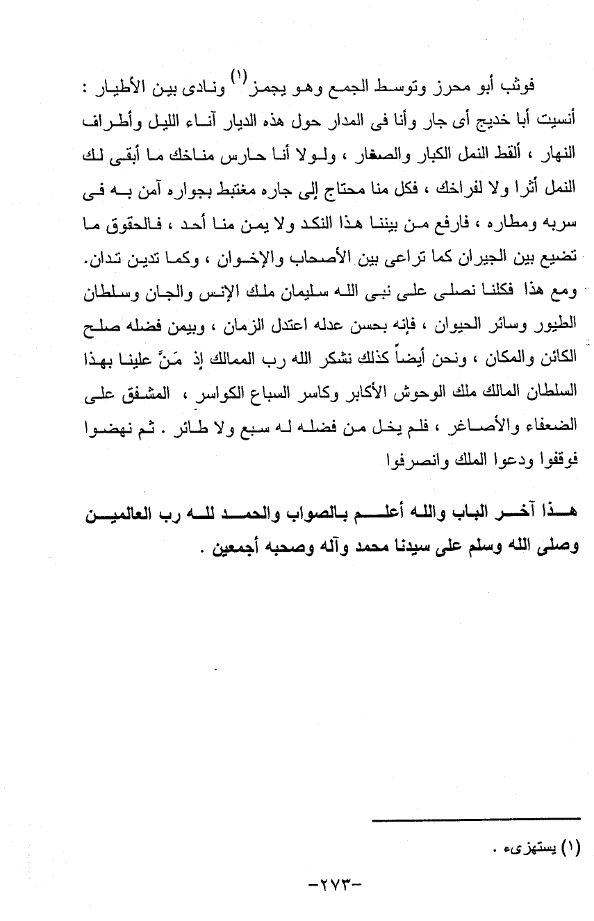 فوئب أبو محرز وتوسط الجمع وهو يجمز ونادى بين الأطيار أنسيت أبا خديج أي جار وأنا في المدار حول هذه الديار آناء الليل وأطراف النهار ألقط النمل الكبار والصغار ولولا أنا حارس مناخك ما أبقى لك النمل أثراً ولا لفراخك فكل منا محتاج إلى جاره مغتبط بجواره آمن به في سريه ومطاره فارفع من بيننا هذا النكد ولا يمن منا أحد على أحد فالحقوق ما تضع بين الجيران كما تراعى بين الأصحاب والأخوان وكما تدين تدان ومع هذا فكلنا نصلي على نبي الله سليمان ملك الأنس والجان وسلطان الطيور وسائر الحيوان فانه بحسن عدله اعتدل الزمان وبيمن فضله صلح الكائن والمكان ونحن أيضاً كذلك نشكر الله رب الممالك إذ من علينا بهذا السلطان المالك ملك الوحوش الأكابر وكاسر السباع الكواسر المشفق على الضعفاء والأصاغر فلم يخل من فضله سبع ولا طائر ثم نهضوا فوقفوا ودعوا للملك وانصرفوا هذا آخر الباب والله أعلم بالصواب والحمد به رب العالمين وصلى الله على سيدنا محمد وآله وصحبه أجمعين.