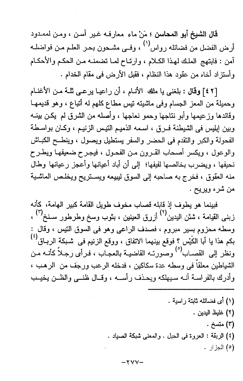 (قال) الشيخ أبو المحاسن من ماء معارفه غير آسن ومن لممدود أرض الفضل من فضائله رواس وفي مشحون بحر العلم من فواضله مواس فابتهج الملك بهذا الكلام وارتاح لما تضمنه من الحكم والأحكام واستزاد أخاه من عقود هذا النظام فقبل الأرض في مقام الخدام وقال بلغني يا ملك الأنام إن راعياً كان يرعى ثلة من الأغنام وحميلة من المعز الجسام وفي ماشيته تيس مطاع كلها له أتباع وهو قديمها وقائدها وزعيمها وأبو نتاجها وحمو نعاجها وأصله من الشرق لم يكن بينه وبين ابليس في الشيطنة فرق اسمه الذميم التيس الزنيم وكان بواسطة الفحول والكبر والتقدم في الحضر والسفر يستطيل ويصول وينطح الكباش والوعول ويكسر أصحاب القرون من الفحول فيجرح ضعيفها ويطرح نحيفها ويضرب بخالصها لفيفها إلى أن أباد أعيانها وأعجز رعيانها وطال منه العقوق فذهب به الراعي إلى السوق ليبيعه ويستريح ويخلص الماشية من شره ويريح فبينما هو يطوف إذا برجل مهول مخوف طويل القامة كبير الهامة كأنه زبنى القيامة شثن اليدين أزرق العينين أسود الخفين بثوب وسخ وطرطور سنخ وسطه محزوم بسير مبزوم فصادف الراعي وهو في السوق ساعي فمد يده إلى التيس وقال بكم هذا يا أبا الكيس فوقع بينهما الاتفاق ووقع الزنيم في شبكة الرباق فتأمل شكل القصاب وصورته القاضية بالعجاب فرأى رجلاً كأنه من الشياطين معلقاً في وسطه عدة سكاكين فدخله الرعب ورجف من الرهب وأدرك بالفراسة أنه سيهلكه ويحذف رأسه وقال ظني والظن يخيب