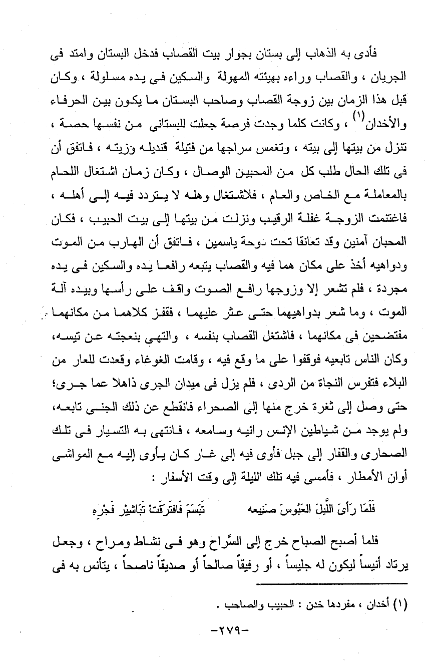 فادى به الذهاب إلى بستان بجوار بيت القصاب فدخل البستان وامتد في الجريان والقصاب وراءه بهيئته المهولة والسكين في يده مسلولة وكان قبل هذا الزمان بين زوجة القصاب وصاحب البستان ما يكون بين الحرفاء والأخدان وكانت كلما وجدت فرصه جعلت للبستاني من نفسها حصة تنزل من بيتها إلى بيته وتغمس سراجها من فتيلة قنديله وزبته فاتفق أن في تلك الحال طلب كل من المحبين الوصال وكان زمان اشتعال اللحام بالمعاملة مع الخاص والعام فلاشتغال وهله لا يتردد فيه إلى أهله فاغتنمت الزوجة غفلة الرقيب ونزلت من بيتها إلى بيت الحبيب فكان المحبان آمنين وقد تعانقا تحت دوحة ياسمين فاتفق أن الهارب من الموت ودواهيه أخذ على مكان هما فيه والقصاب يتبعه رافعاً يده والسكين في يده مجردة فلم تشعر إلا وزوجها رافع الصوت واقف على رأسهما وبيده آلة الموت وما شعر بدواهيهما حتى عثر عليهما فقفز كلاهما من مكانهما مفتضحين في مكانهما فاشتغل القصاب بنفسه والتهى بنعجته عن تيسه وكان الناس تابعيه فوقفوا على ما وقع فيه وقامت الغوغاء وقعدت للعار من البلاء فتفرس النجاة من الردى فلم يزل في ميدان الجرى ذاهلاً عما جرى حتى وصل إلى ثغرة خرج منها إلى الصحراء فانقطع عن ذلك الجنى تابعه ولم يوجد من شياطين الأنس رائيه وسامعه فانتهى التيسار في تلك الصحاري والقفار إلى جبل فأوى فيه إلى غار كان يأوي إليه مع المواشي أو أن الأمطار فأمسى فيه تلك الليلة إلى وقت الأسفار: