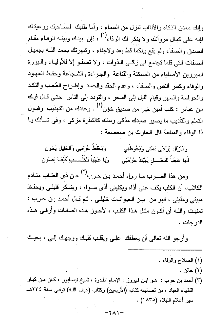 ومن هذا الضرب ما رواه أحمد بن حرب عن ذي العتاب منادم الكلاب أن الكلب يكف عني أذاه ويكفيني أذى سواه ويشكر قليلي ويحفظ مبيتي ومقيلي فهو من بين الحيوان خليلي ثم قال أحمد ابن حرب تمنيت والله أن أكون مثل هذا الكلب لأحوز هذه الصفات وأرقى هذه الدرجات وأرجو الله تعالى أن يعطفك علي ويقلب قلبك ووجهك إلي بحيث