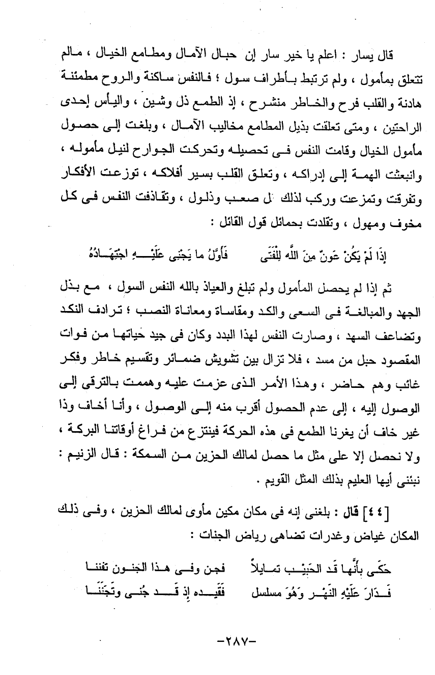 قال يسار أعلم يا خير سار أن حبال الآمال ومطامع الخيال ما لم تتعلق بمأمول ترتبط بأطراف سول فالنفس ساكنه