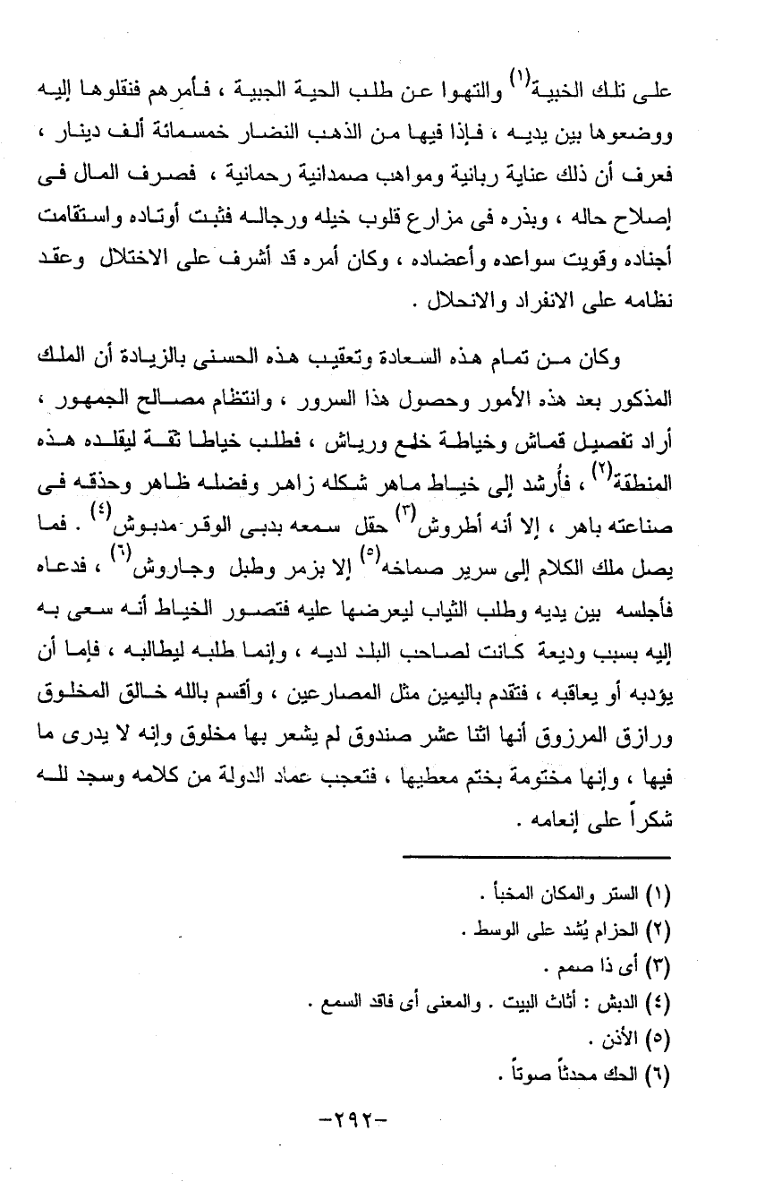 على تلك الخبيه والتهوا عن طلب الحية والجبيه فأمرهم فنقلوها إليه ووضعوها بين يديه فإذا فيها من الذهب النضار خمسمائة ألف دينار فعرف أن ذلك عناية ربانية ومواهب صمدانية رحمانية فصرف المال في إصلاح حاله وبذره في مزارع قلوب خيله ورجاله فثبتت أوتاده واستقامت أجناده وقويت سواعده وأعضاده وكان أمره قد اشرف على الاختلال وعقد نظامه على الانفراد والانحلال وكان من تمام هذه السعادة وتعقيب هذه الحسنى بالزيادة أن الملك المذكور بعد هذه الأمور وحصول هذا السرور وانتظام مصالح الجمهور أراد تفصيل قماش وخياطة خلع ورياش فطلب خياطاً ثقة ليقلده هذه المنطقة فارشد إلى خياط ماهر شكله زاهر وفضله ظاهر وحذقه في صناعته باهر إلا أنه أطروش حقل سمعه بدبي الوقرمد بوش فما يصل ملك الكلام إلى سرير صماخه إلا بزمر وطبل وجاووش فدعاه فأجلسه بين يديه وطلب الثياب ليعرضها عليه فتصور الخياط أنه سعى به إليه بسبب وديعة كانت لصاحب البلد لديه وإنما طلبه ليطالبه فأما أن يؤديها أو يعاقبه فتقدم باليمن مثل المصارعين واقسم بالله خالق المخلوق ورازق المرزوق أنها اثنا عشر صندوق لم يشعر بها مخلوق وأنه لا يدري ما فيها وأنها مختومة بختم معطيها فتعجب عماد الدولة من كلامه وسجد لله شكراً على إنعامه