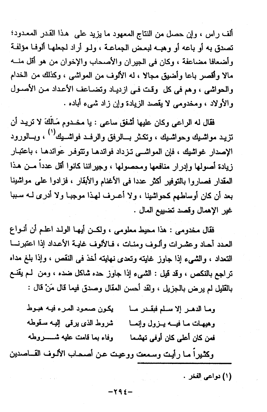 ألف رأس وأن حصل من النتاج المعهود ما يزيد على هذا القدر المعدود تصدق به أو باعه أو وهبه لبعض الجماعة ولو أراد لجعلها ألوفاً مؤلفة وأضعافاً مضاعفة وكان في الجيران والأصحاب والأخوان من هو أقل منه مالاً واقصر باعاً وأضيق مجالاً له الألوف من المواشي وكذلك من الخدام والحواشي وهم في كل وقت في ازدياد وتضاعف الأعداد من الأصول والأولاد ومخدومي لا يقصد الزيادة وأن زاد شيء أباده فقال له الراعي وكان عليها أشفق ساعييا مخدوم ما لك لا تريد أن تزيد مواشيك وحواشيك وتكثر بالرفق والرفد فواشيك وبالورد والإصدار غواشيك فان المواشي تزداد فوائدها وتتوفر عوائدها باعتبار زيادة أصولها وإدرار منافعها ومحصولها وجيراننا كانوا أقل عدداً من هذا المقدار فصاروا بالتوفير أكثر عدداً في الأغنام والأبقار فزادوا على مواشينا بعد أن كان أوساطهم كحواشينا ولا أعرف لهذا موجباً ولا أدري له سبباً غير الإهمال وقصد تضييع المال فقال له مخدومي هذا محيط به معلومي ولكن أيها الولد أعلم أن أنواع العدد آحاد وعشرات وألوف ومئات فألوف غاية الأعداد إذا اعتبرنا التعداد والشيء إذا جاوزنا غايته وتعدى نهايته أخذ في النقص وإذا بلغ مداه تراجع بالنكص وقد قيل الشيء إذا جاوز حده شاكل ضده ومن لم يقنع بالقليل لم يرض بالجزيل ولقد أحسن المقال وصدق فيما قال من قال: