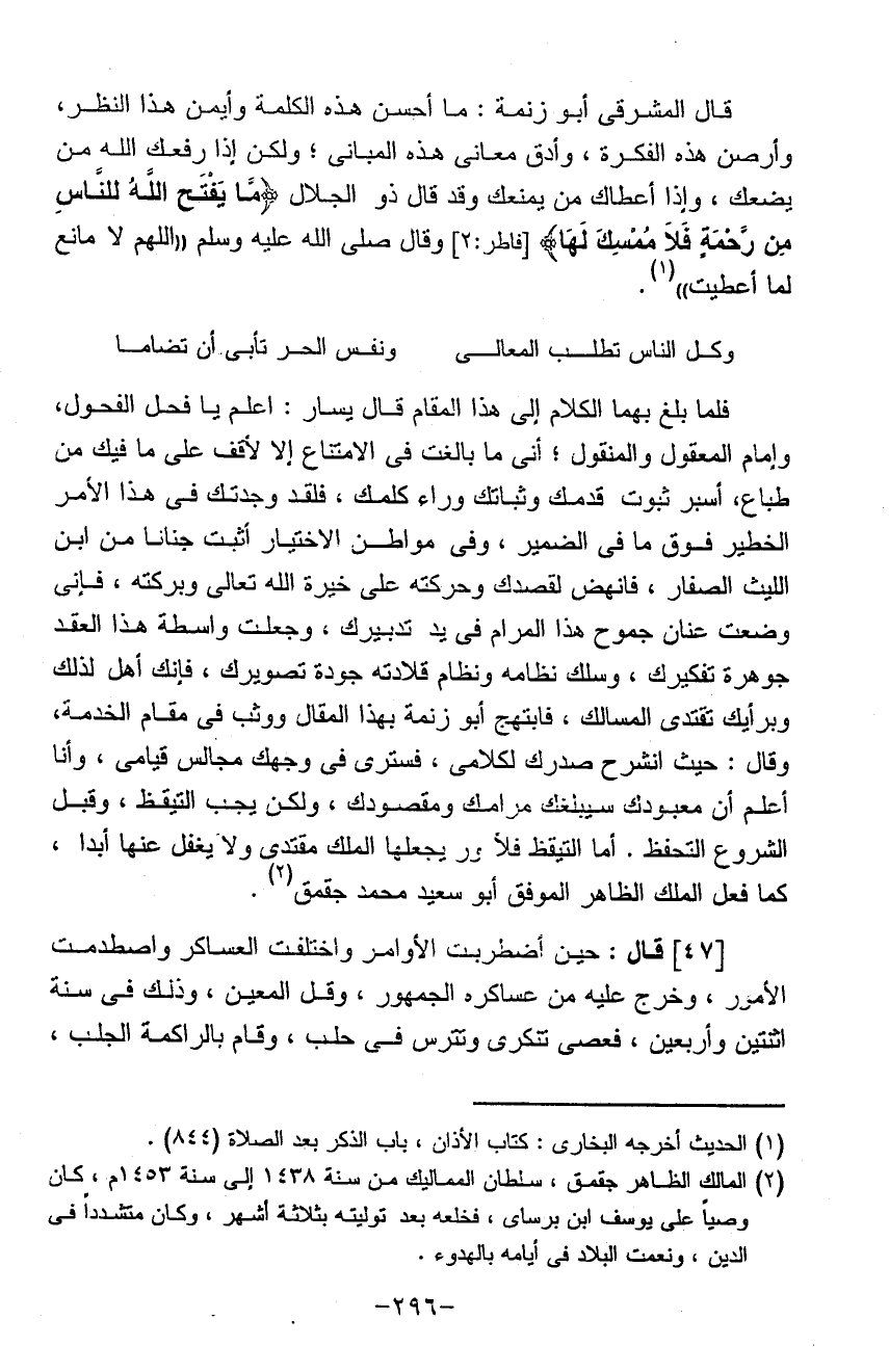قال المشرقي أبو زنمه ما أحسن هذه الكلمة وأيمن هذا النظر وأرصن هذه الفكر وأدق معاني هذه المباني ولكن إذا رفعك الله من يضعك وإذا أعطاك من يمنعك وقد قال ذو الجلال ما يفتح الله للناس من رحمة فلا يمسك لها وقال صلى الله عليه وسلم اللهم لا مانع لما أعطيت: