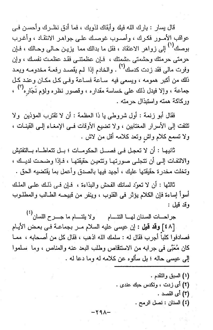 جراحات السنان لها التثام ... ولا يلتام ما جرح اللسان وقد قيل إن عيسى عليه السلام مر بجماعة في بعض الأيام فصادفوا كلباً أجرب فقال له سلمك الله أذهب فقال كل من أصحابه مما كان معبي في جرابه من الاستيقاض وطلب البعد عنه والمناص وما سلموا إلى عيسى حاله بل سألوه عن كلامه له وما دعا له