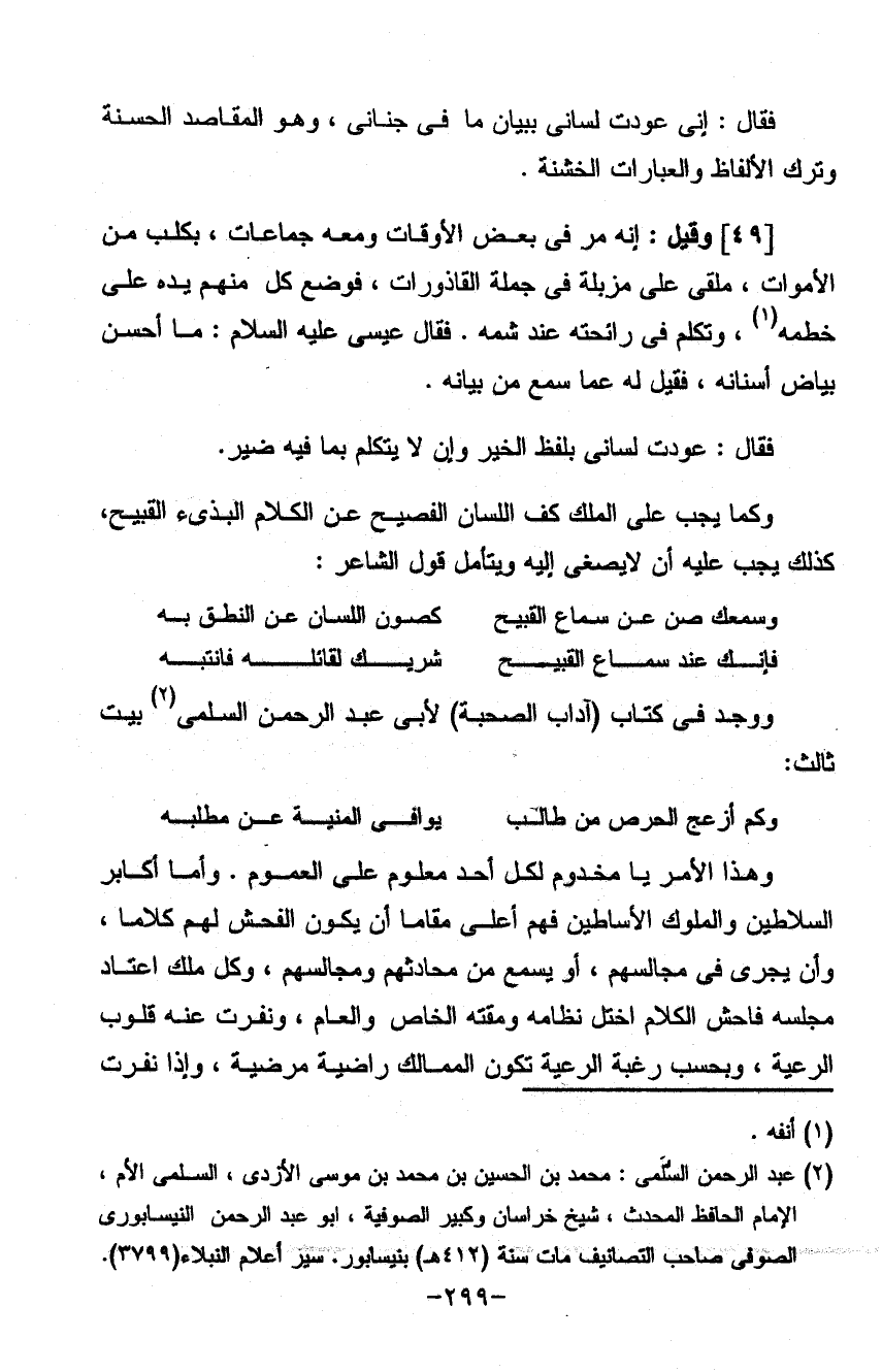 وهذا الأمر يا مخدوم لكل أحد معلوم على العموم وأما أكابر السلاطين والملوك الأساطين فهم أعلى مقاماً أن يكون الفحش لهم كلاماً وأن يجري في مجالسهم أو يسمع من محادثتهم ومجالسهم وكل ملك اعتاد مجلسه فاحش الكلام اختل نظامه ومقته الخاص والعام ونفرت عنه قلوب الرعية وبحسب رغبة الرعية تكون الممالك راضية مرضية وإذا نفرت