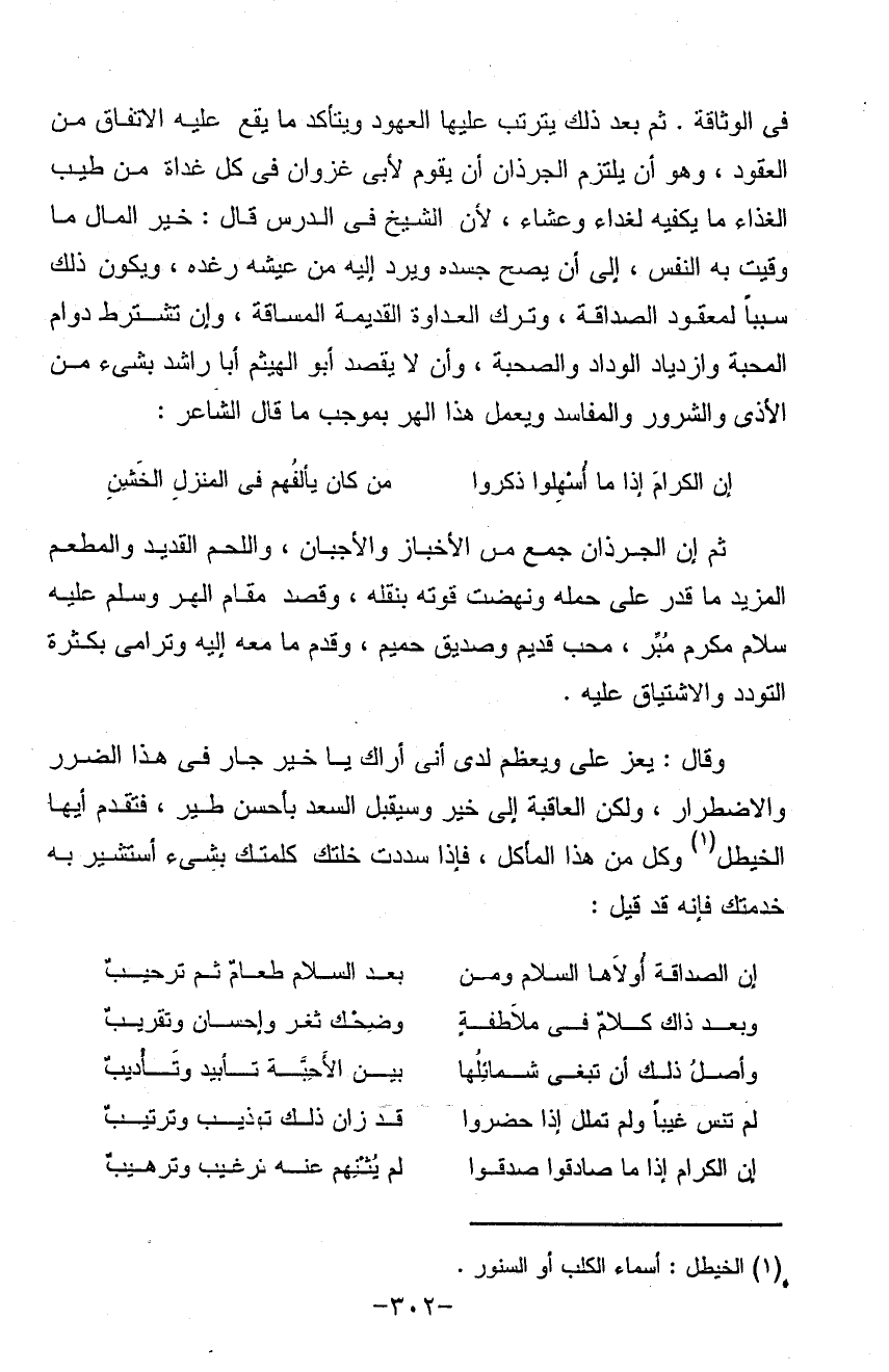 في الوثاقة ثم بعد ذلك يترتب عليها العهود ويتأكد ما يقع عليه الاتفاق من العقود وهو أن يلتزم الجرذان أن يقوم لأبي غزوان في كل غداة من طيب الغذاء ما يكفيه لغداء وعشاء لأن الشيخ في الدرس قال خير المال وما وقيت به النفس إلى أن يصح جسده ويرد إليه من عيشه رغده ويكون ذلك سبباً لمعقود الصداقة وترك العداوة القديمة المساقة وأن تشترط دوام المحبة وازدياد الوداد والصحبة وأن لا يقصد أبو الهيثم أبار راشد بشيء من الأذى والشرور والمفاسد ويعمل هذا الهر بموجب ما قال الشاعر:
