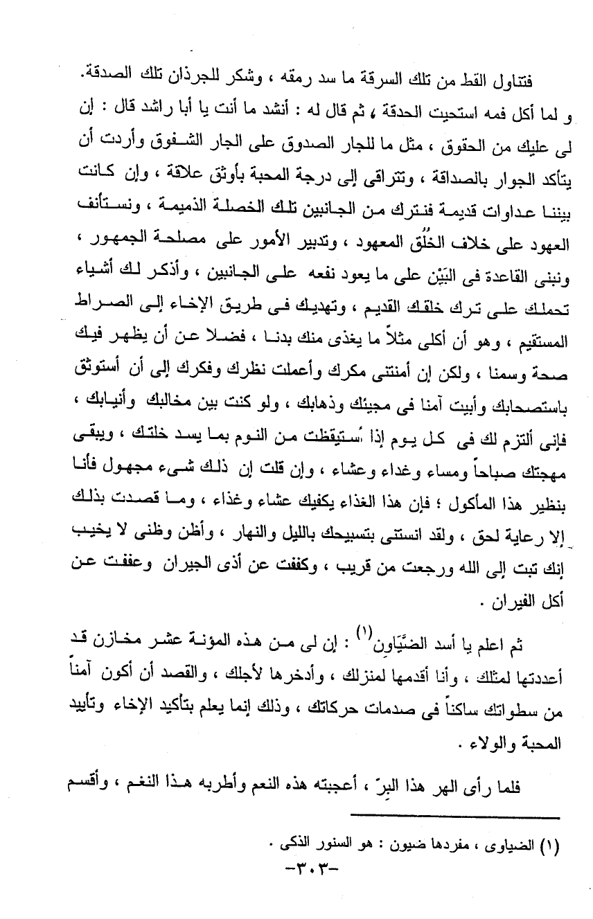 فتناول القط من تلك السرقة ما سد رمقه وشكر للجرذان تلك الصدقة ولما أكل فمه استحيت الحدقة ثم قال له أنشد ما أنت ناشد يا أبا راشد قال إن لي عليك من الحقوق مثل ما للجار الصدوق على الجار الشفوق وأردت أن يتأكد الجوار بالصداقة وتتراقى إلى درجة المحبة بأوثق علاقة وأن كانت بيننا عداوة قديمة فنترك من الجانبين تلك الخصلة الذميمة ونستأنف العهود على خلاف الخلق المعهود وتدبير الأمور على مصلحة الجمهور ونبني القاعدة في البين على ما يعود نفعه على الجانبين وأذكر بك أشياء تحملك على ترك خلقك القديم وتهديك في طريق الإخاء إلى الصراط المستقيم وهو أن أكلي مثلا ما يغذي منك بدناً فضلاً عن أن يظهر فيك صحة وسمناً ولكن أن أمنتني مكرك وأعملت نظرك وفكرك ثم رغبت في صحبتي وعاهدتني على سلوك طريق مودتي وأكدمت أي أبا غزوان ذلك بمغلظات الأيمان إلى أن أستوثق باستصحابك وأبيت آمنا في مجيئك وذهابك ولو كنت بين مخالبك وأنيابك فأني ألتزم لك في كل يوم إذا استيقظت من النوم بما يسد خلتك ويبقي مهجتك صباحاً ومساء وغداء وعشاء وإن قلت أن ذلك شيء مجهول فأنا أقدره بنظير هذا المأكول فان هذا الغذاء يكفيك عشاء وغداء وماقصدت بذلك إلا رعاية لحق الجوار ولقد آنستني تسبيحك بالليل والنهار وأظن وظني لا يخيب أنك تبت إلى الله ورجعت من قريب وكففت عن أذى الجيران وعففت عن أكل الفيران ثم أعلم يا أسد الضياون أن لي من هذه المؤنة عشر مخازن قد أعددتها لمثلك وأنا أقدمها لمنزلك وادخرها لأجلك والقصد أن أكون آمناً من سطواتك ساكناً في صدمات حركاتك وذلك إنما يعلم بتأكيد الإخاء وتأييد المحبة والولاء فلما رأى الهر هذا البر أعجبته هذه النعم وأطربه هذا النغم وأقسم