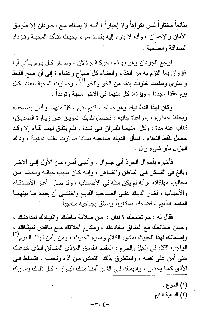 طائعاً مختاراً ليس إكراهاً ولا إجباراً أنه لا يسلك مع الجرذان إلا طريق الأمان والإحسان وأنه لا ينوء إليه بقصد سوء بحيث تتأكد المحبة وتزداد الصداقة والصحبة فرجع الجرذان وهو بهذه الحركة جذلان وصار كل يوم يأتي أبا غزوان بما التزم به من الغداء والعشاء كل صباح وعشاء إلى أن صح القط واستوى وسلمت خلوات بدنه من الخو والخوا وصارت المحبة تنعه بكل يوم عقد مجدداً ويزداد كل منهما في الآخر محبة وتودداً وكان لهذا القط ديك وهو صاحب قديم وصديق نديم كل منهما يأنس بصاحبه ويحفظ خاطره بمراعاة جانبه للديك تعويق عن زيارة الصديق فغاب عنه مدة وكل منهما للفراق في شده فلم يتفق لهما إلا وقد حصل للقط الشفاء وزال الشقاء فسأل الديك صاحبه بماذا صارت علته ذاهبة وذاك الهزال بأي شيء زال فاخبره بأحوال الجرذ أبي جوال وأنهى أمره من الأول إلى الآخر وبالغ في الشكر في الباطن والظاهر وأنه كان سبب حياته ونجاته من مخاليب مهلكاته وأنه لم يكن مثله في الأصحاب وقد صار أعز الأصدقاء والأحباب فغار الديك على الصاحب القديم وأختشى أن يفسد ما بينهما المفسد الذميم فضحك مستغرباً وصفق بجناحيه متعجباً فقال له مم تضحك فقال من سلامة باطنك وانقيادك لمداهنك وحسن صنائعك مع المنافق مخادعك ومكارم أخلاقك مع ناقض ميثاقك وإصغائك لهذا الخبيث بمشوه الكلام ومموه الحديث ومن يا من لهذا البرم الواجب القتل في الحل والحرم المفسد لفاسق المؤذي المنافق الذي خدعك حتى أمن على نفسه واستطرق بذلك التمكن من أذاه ونحسه فتسلط الأذى كما يختار وانهمك في الشر آمناً منك البوار كل ذلك بسببك