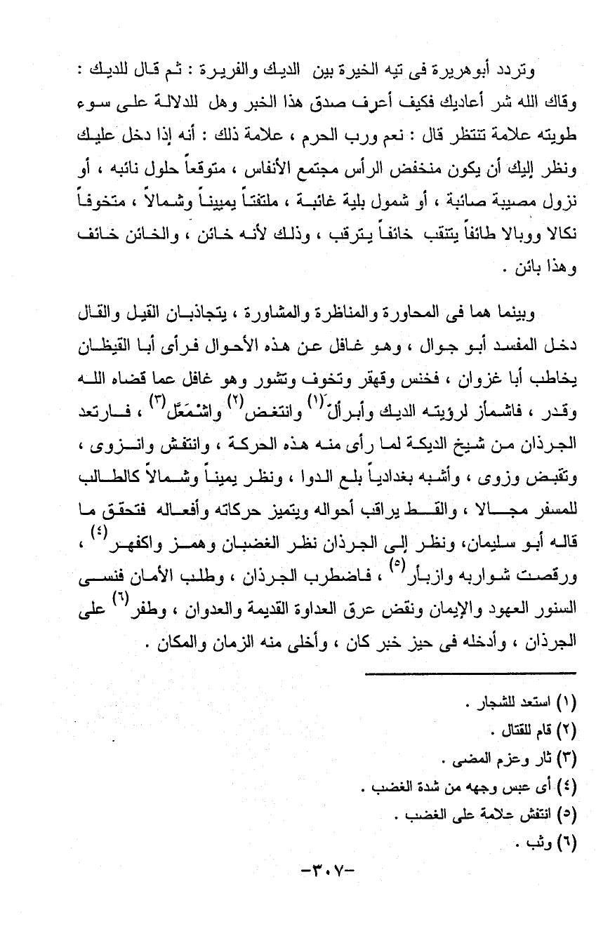 وتردد أبو هريرة في تيه الخيرة بين الديك والفريره ثم قال للديك وقاك الله شر أعاديك فكيف أعرف صدق هذا الحبر وهل للدلالة على سوء طويته علامة تنتظر قال نعم ورب الحرم علامة ذلك أنه إذا دخل عليك ونظر إليه أن يكون منخفض الرأس مجتمع الأنفاس متوقعاً حلول نائبه أو نزول مصيبة صائبة أو شمول بليه غائبة ملتفتاً يميناً وشمالاً متخوفاً نكالاً ووبالاً طائفاً يتنقب خائفاً يترقب وذلك لأنه خائن والخائن خائف وهذا بائن وبينما هما في المحاورة والمناظرة والمشاورة يتجاذبان القيل والقال دخل المفسد أبو جوال وهو غافل عن هذه الأحوال فرأى أبا القيظان يخاطب أبا غزوان فخنس وقهقر وتخوف وتشور وهو غافل عما قضاه الله وقدر فاشمأز لرؤيته الديك وابرأل وانتغض واشمعل فارتعد الجرذان من شيخ الديكة لما رأى منه هذه الحركة وانتفش وانزوى وتقبض وزوى وأشبه بغدادياً بلع الدوا ونظر يميناً وشمالاً كالطالب للمفر مجالاً والقط يراقب أحواله ويتميز حركاته وأفعاله فتحقق ما قاله أبو سليمان ونظر إلى الجرذان نظر الغضبان وهمز واكفهور ورقصت شواربه وابزأر فاضطر الجرذان وطلب الأمان فنسي السنور العهود والأيمان ونفض عرق العداوة القديمة والعدوان وطفر على الجرذان وأدخله في خبر كان وأخلى منه الزمان والمكان