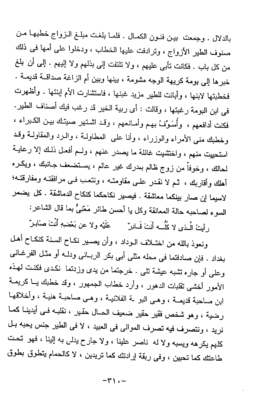 ونعوذ بالله من اختلاف الوداد وأن يصبر نكاح السنة كنكاح أهل بغداد فأن صادفتما في محله مثلي أبي بكر الرباني ودله أو مثل الفرغاني وعلى أو جارة تشبه عيشة تلي خرجتما من يدي وزدتما نكدي فكنت لهذه الأمور أخشى تقلبات الدهور وأرد خطاب الجمهور وقد خطبك يا كريمة ابن صاحبة قديمة وهي البومة الفلانية وهي صاحبة هنيه وأخلاق ابنها رضيه وهو شخص فقير الحال حقير نقلبه في أيدينا كما نريد ونتصرف فيه تصرف الموالي في العبيد لا في الطير جنس يحبه بل كلهم يكرهه ويسبه ولا لهناصر علينا ولا جارح يدلي به إلينا فهو تحت طاعتك كما تحبين وفي ربقة إرادتك كما تريدين لا كالحمام يتطوق بطوق