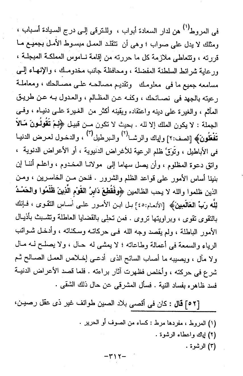 في المروط هن لدار السعادة أبواب وللترقي إلى درج السيادة أسباب ومثلك لا يدل على صواب وهي أن تتقلد العمل مبسوط الأمل بجميع ما قررته وتتعاطى ملازمة كل ما حررته من إقامة ناموس المملكة المبجلة ورعاية شرائط السلطنة المفضلة ومحافظة جانب مخدومك والإنهاء إلى مسامعه جميع ما في معلومك وتقديم مصالحه على مصالحك ومعاملة رعيته بالجهد في نصائحك وكفه عن المظالم والعدول به عن طريق المآثم والغيرة على دينه واعتقاده ويقينه أكثر من الغيرة على دنياه وفي الجملة لا يكون الملك إلا لله بحيث لا تكون من قبيل لم تقولون ما لا تفعلون وإياك والرشا والبرطيل والدخول لعرض الدنيا في الأباطيل وتوق ظلم الرعية للأغراض الدنيه أو الأعراض الدنويه واتق دعوة المظلوم وإن يصل سهامها إلى مولانا المخدوم وأعلم أننا إن بنينا أساس الأمور على قواعد الظلم والشرور فنحن من الخاسرين ومن الذين ظلموا والله لا يحب الظالمين وسيقطع دابر القوم الذين ظلموا والحمد لله رب العالمين بل ابن الأمور على أساس التقوى فانك بالتقوى تقوى وبروايتها تروى فمن تحلى بالقضايا العاطلة وتشبث بأذيال الأمور الباطلة ولم يقصد وجه الله في حركاته وسكناته وأدخل شوائب الرباء والسمعة في أعماله وطاعاته لا يمشي له حال ولا يصلح له مال ولا مآل ويصيبه ما أصاب السائح الذي ادعى إخلاص العمل الصالح ثم شرع في حركته وأخلص فظهرت آثار براءته فلما قصد الأعراض الدنيه فسد ظاهره بفساد النيه فسأل المشرقي عن حال ذلك الشقي (قال) كان في أقصى بلاد الصين طوائف غير ذي عقل رصين