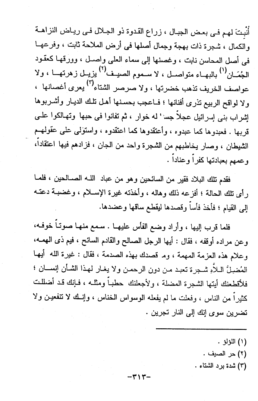 في حبها وتهالكوا على قربها فعبدوها كما عبدوه واعتقدوها كما اعتقدوه واستولى على عقولهم الشيطان وصار يخاطبهم من الشجرة واحد من الجان فزادهم فيها اعتقاداً وعمهم بعبادتها كفراً وعناداً فقدم تلك البلاد فقير من السائحين وهو من عباد الله الصالحين فلما رأى تلك الحالة أفزعه ذلك وهاله وأخذته غيرة الإسلام وغضبة دعته ليالقيام فأخذ فأساً وقصدها ليقطع ساقها وعضدها فلما قرب إليها وأراد وضع الفأس عليها سمع منها صوتاً خوفه وعن مراده أوقفه فقال أيها الرجل الصالح والقادم السائح فيم ذي الهمة وعلام هذه العزمة المهمة وما قصدك بهذه الصدمة فقال غيرة لله أيها المضل اللاه شجرة تعبد من دون الرحمن ولا يغار لهذا الشان إنسان فلاقطعنك أيتها الشجرة المضلة ولا جعلنك حطباً ومثله فانك قد أضللت كثيراً من الناس وفعلت ما لم يفعله الوسواس الخناس وأنك لا تنفيع ولا تضرين سوى إنك إلى النار تجرين
