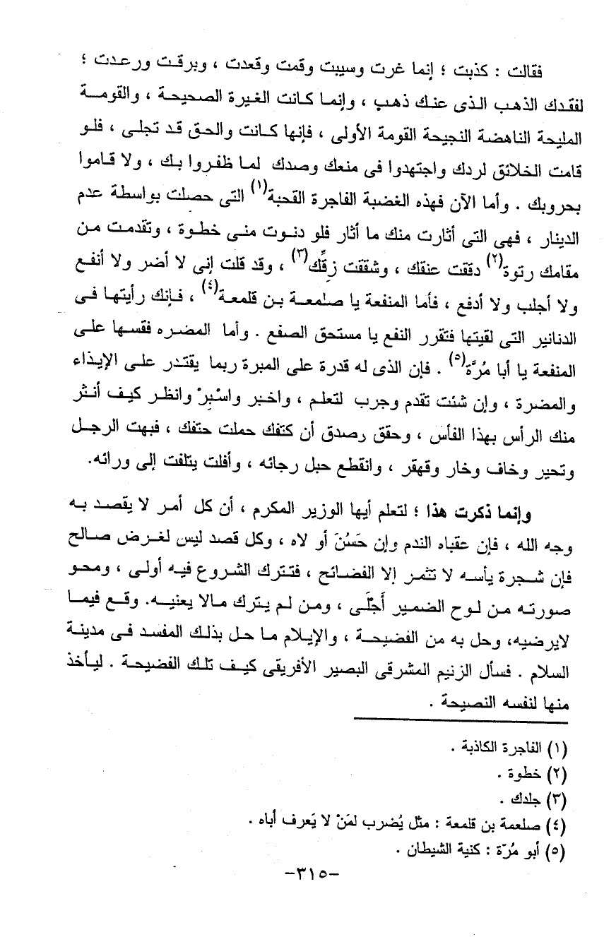 فقالت كذبت إنما غرت وسيبت وقمت وقعدت وبرقت ورعدت لفقدك الذهب الذي عنك ذهب وإنما كانت الغيرة الصحيحة والقومة المليحة الناهضة النجيحة القومة الأولى فإنها كانت والحق قد تجلى فلو قامت الجلائق لردك واجتهد وافي منعك وصدك لما ظفر وابك ولا قاموا بحروبك وأما الآن فهذه الغضبة غضبة الفاجرة لقحبة التي حصلت بواسطة عدم الدينار فهي التي أثارت منك ما أثار فلو دنوت مني خطوه وتقدمت من مقامك رتوه دققت عنقك وشققت زقك وقد قلت أني لا أضر ولا أنفع ولا أجلب ولا أدفع فأما المنفعة يا صلمعة بن قلمعة فأنك رايتها في الدنانير التي لقينها فتقرر النفع يا مستحق الصفع وأما المضرة فقسها على المنفعة يا أبا مره فان الذي له قدرة على المبرة ربما يقتدر على الإيذاء والمضرة وإن شئت تقدم وجرب لتعلم واخبر واسبر وانظر كيف أنثر منك لراس بهذا الفأس وحقق وصدق أن كتفك حملت حتفك فبهت الرجل وتحير وخاف وخار وقهقر وانقطع حبل رجائه وأفلت يتلفت إلى ورائه (وإنما ذكرت) هذا لتعلم أيها الوزير المكرم إن كل أمر لا يقصد به وجه الله فان عقباه الندم وإن حسن أولاه وكل قصد ليس لغرض صالح فان شجرة غراسه لا تثمر الفضائح فترك الشروع فيه أولى ومحو صورته من لوح الضمير أجلى ومن لم يترك مالاً يعنيه وقع فيما يعنيه وحل به من الفضيحة والأيام ما حل بذلك المفسد في مدينة السلام فسأل الزنيم المشرقي البصير الأفريقي كيف كانت تلك الفضيحة ليأخذ منها لنفسه النصيحة