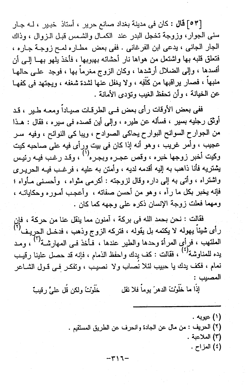 مغرماً بها فوجد على حالها منبهاً فصار يراقبها من كلفه ولا يغفل عنها لشدة شغفه ويجتهد فيكفها عن الخيانة وأن تحفظ الغيب وتؤدي الأمانة ففي بعض الأوقات رأى في بعض الطرقات صياداً ومعه طير أوثق رجليه بسير فسأله عن طيره وإلى أين قصده في سيره فقال هذا من الجوارح السوانح لا البوارح يحاكي الصوادح ويباكي النوائح وفيه سر عجيب وأمر غريب وهو أنه إذا كان في بيت ورأى فيه على صاحبه كيت وكيت أخبر زوجها خبره وقص عجره ويجره وقد رغب فيه رئيس يشتريه فأنا ذاهب به إليه أقدمه لديه وامتن به عليه فرغب فيه الحريري واشتراه وأتى به إلى داره وقال لزوجته أكرمي مثواه وأحسني مأواه فانه يخبر بكل ما رآه وهو من أحسن صفاته وأعجب أموره وحكاياته ومهما فعلت زوجة الإنسان ذكره على وجهه كما كان فقالت نحن بحمد الله في بركه آمنون مما ينقل عنا من حركه فان رأى شيأ يهوله لا يكتمه عنا بل يقوله فتركه إلى الزوج وذهب فدخل الحريف الملتهب فرأى المرأة وحدها والطير عندها فأخذ في المهارشه ومديدة للمناوشة فقالت كف يدك واحفظ الذمام فانه قد حصل علينا رقيب نمام فكف يدك يا حبيب لئلا نصاب ولا نصيب وتفكر في قول الشاعر المصيب:
