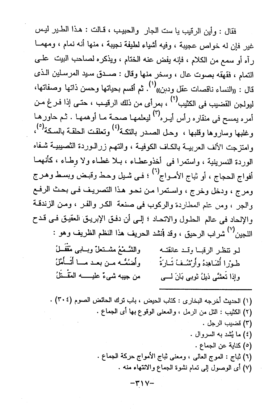 فقال وأين الرقيب يا ست الجار والحبيب قالت هذا الطير ليس غير فان له خواص عجيبة وفيه أشياء لطيفة نجيبه منها أنه تمام ومهما رآه أو سمع من الكلام فانه يفض عنه الختام ويذكره لصاحب البيت على التمام فقهقه بصوت عال وسخر منها وقال صدق سيد المرسلين الذي قال النساء ناقصات عقل ودين ثم أقسم بحياتها وحسن ذاتها وصفاتها ليولجن القضيب في الكثيب بمرأى من ذلك الرقيب حتى إذا فرغ من أمره يمسح في منقاره رأس ايره ليعملها صحة ما أوهمها ثم حاورها وغلبها وساورها وقلبها وحل الصدر بالتكمه وتعلقت الحلقة بالسكة وامتزجت الألف العربية بالكاف الكوفية والتهم زر الوردة الثصبيبة شفاه الوردة النسرينينه واستمر في أخذ وعطاء ولا وطاء كأنهما أفواج الحجاج أو ثباج الأمواج في شيل وحط وقبض وبسط وهرج ومرج ودخل وخرج واستمر من نحو هذا التصريف في بحث الرفع والجر ومن علم المطاردة والركوب في صنعة الكر والفر ومن علم الزندقة والإلحاد في عالم الحلول والاتحاد إلى أن دفق الإبريق العقيق في قدح اللجين شراب الرحيق وقد أنشد الحريف هذا النظم الظريف وهو: