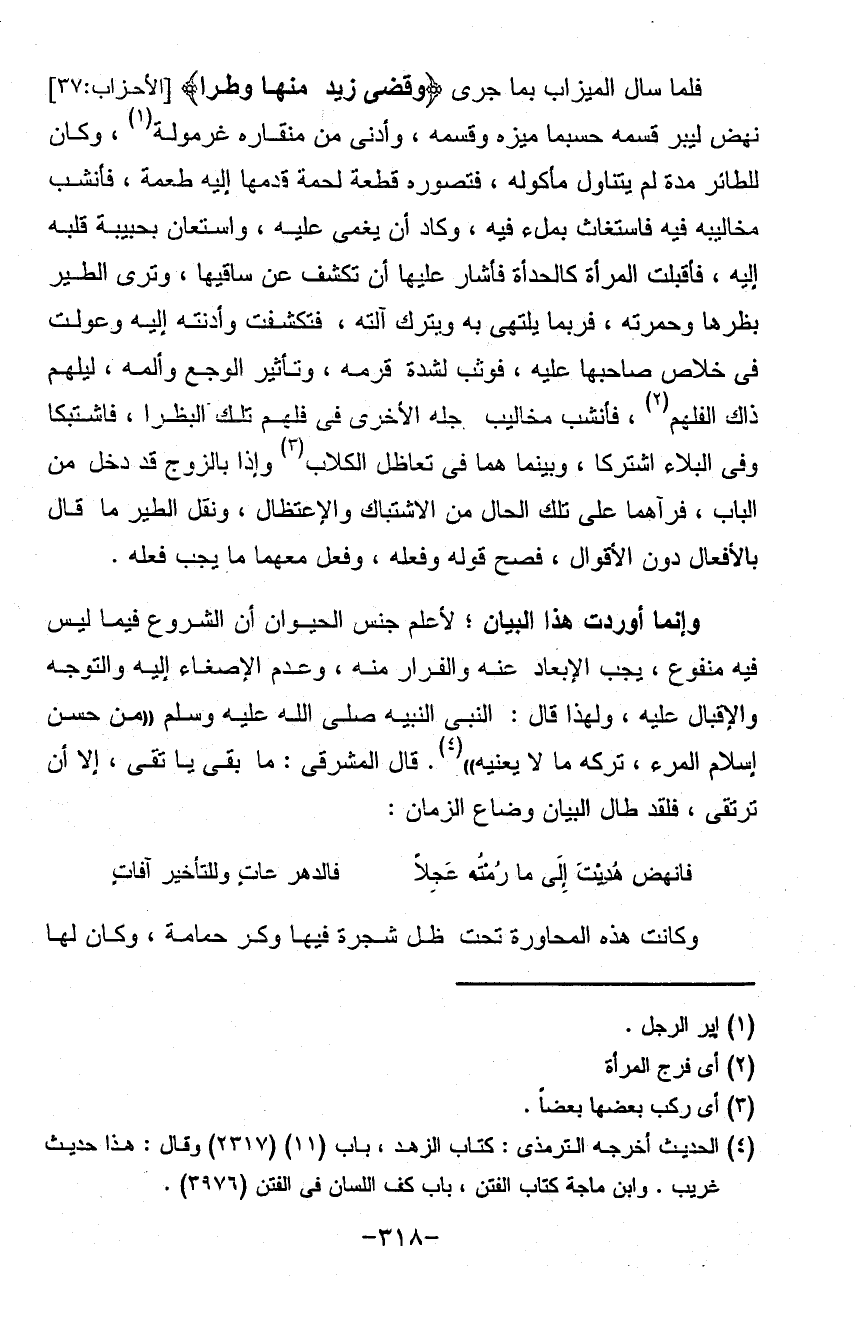 فلما سال الميزاب بما جرى وقضى زيد منها وطرا نهض ليبر قسمه حسبما ميزه وقسمه وأدنى من منقاره غرموله وكان للطائر مدة لم يتناول مأكوله فتصوره قطعة لحمه صدمها إليه طعمه فانشب مخاليبه فيه فاستغاث بملء فيه وكاد أن يغمى عليه واستعان بحبيبة قلبه إليه فأقبلت المرأة كالحدأة فأشار عليها أن تكشف عن ساقيها وترى الطير بظرها وحمرته فربما يلتهي ويترك آلته فتكشفت وأدنته إليه وعولت في خلاص صاحبها عليه فوثب لشدة قرمه وتأثير الجوع وألمه ليلهم ذاك الفلهم فانشب مخاليب رجله الأخرى في فلهم تلك البظرا فاشتبكوا في البلاء اشتركا وبينما هما في تعاظل الكلاب وإذا بالزوج قد دخل من الباب فرآهما على تلك الحال من الاشتباك والاعتظال ونقل الطير ما قال بالأفعال دون الأقوال فصح قوله وفعله وفعل مهما ما يجب فعله (وإنما أوردت) هذا البيان لا علم أشرف جنس الحيوان إن الشروع فيما ليس فيه منفوع يجب الأبعاد عنه والفرار منه وعدم الإصغاء إليه والتوجه والإقبال عليه ولهذا قال النبي النبيه صلى الله عليه وسلم عليه من حسن إسلام المرء تركه ما لا يعنيه قال المشرقي ما بقي إلا أن ترتقي فلقد طال البيان وضاع الزمان (شعر) :