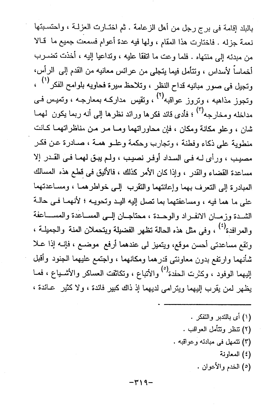بالبلد إقامة في برج رجل من أهلالزعامة ثم اختارت العزلة واحتسبتها نعمة جزلة فاختارت هذا المقام ولها فيه عدة أعوام فسمعت جميع ما قالا من مبدئه إلى منتهاه فلما وعت ما اتفقا عليه وتداعيا إليه أخذت تضرب أخماساً لأسداس وتتأمل فيما يتجلى من عرائس معانيه من القدم إلى الرأس وتجيل في صور مبانيه قداح النظر وتلاحظ سيرة فحاويه بلوامح الفكر وتجوز مذاهبه وتروز عواقبه وتقيس مداركه بمعرجه وتميس في مداخله ومخارجه فادى قائد فكرها ورائد نظرها إلى أنه ربما يكون لهما شأن وعلو مكانة ومكان فان محاورتهما وما مر من مناظراتهما كانت منطوية على ذكاء وفطنه وتجارب وحكمة وعلو همه صادرة عن فكره مصيب ورأى له في السداد أوفر نصيب ولم يبق لهما في القدر إلا مساعدة القضاء والقدر وإذا كان الأمر كذلك قالا ليق في قطع هذه المسالك المبادرة إلى التعرف بهما وإعانتهما والتقرب إلى خواطرهما ومساعدتهما على ما هما فيه ومساعفتهما بما تصل إليه اليد وتحويه لأنهما في حالة الشدة وزمان الانفارد والوحده محتاجان إلى المساعدة والمساعفة والمرافده وفي مثل هذه الحالة تظهر الفضيلة ويتحملان المنة والجميلة وتقع مساعدتي أحسن موقع ويتميز لي عندهما أرفع موضع فأنه إذا علا شأنهما وارتفع بدون معاونتي قدرهما ومكانهما واجتمع عليهما الجنود وأقبل إليهما الوفود وكثرت الحفدة والأتباع وتكاتفت العساكر والأشياع فما يظهر لمن يتقرب إليهما ويترامى لديهما إذ ذاك كبير فائدة ولا كثير عائده