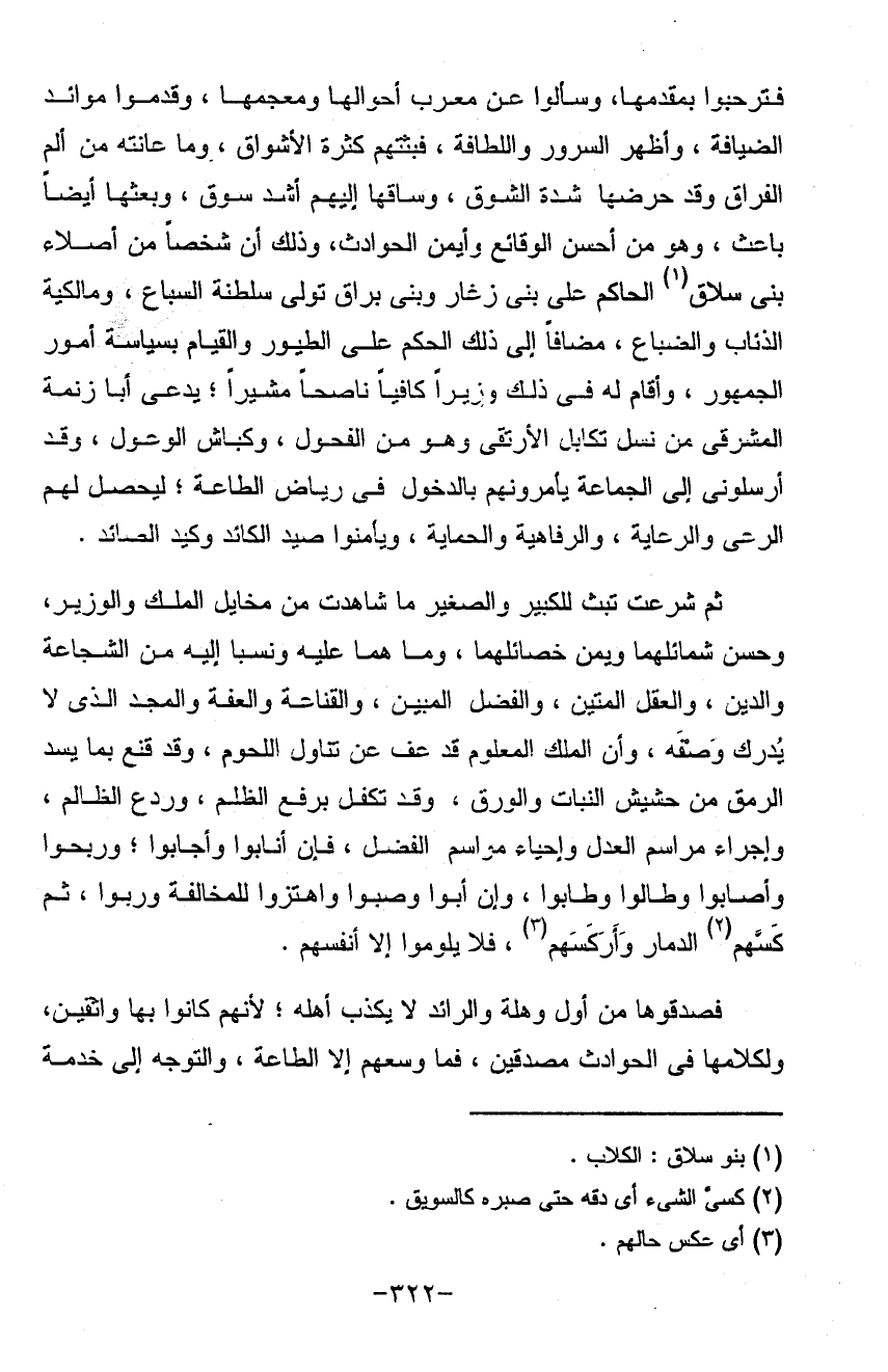 فترحبوا بمقدمها وسألوا عن معرب أحوال ومعجمها وقدموا موائد الضيافة وأظهروا السرور واللطافه فبثتهم كثرة الأشواق وما عانته من ألم الفراق وقد حرضها شدة الشوق وساقها إليهم أشد سوق وبعثها أيضاً باعث وهو من أحسن الوقائع وأيمن الحوادث وذلك أن شخصاً من أصلاء بني سلاق الحاكم على بني زغار وبني براق تولى سلطنة السباع ومالكيه الذئاب والضباع مضافاً إلى ذلك الحكم على الطيور والقيام بسياسة أمور الجمهور وأقام له في ذلك وزيراً كافياً ناصحاً مشيراً يدعى أبا زنمه المشرقي من نسل تكابك الأرتقى وهو من الفحول وكباش الوعول وقد أرسلوني إلى الجماعة يأمرونهم بالدخول في رياض الطاعة ليحصل لهم الرعي والرعاية والرفاهية والحماية ويأمنوا صيد الكائد وكيداً لصائد ثم شرعت نبت للكبير والصغير ما شاهدت من مخابل الملك والوزير وحسن شمائلها ويمن خصائلهما وما هما عليه ونسبا إليه من الشجاعة والدين والعقل المتين والفضل المبين والقناعة والعفه والمجد الذي لا تدرك وصفه وأن الملك المعلوم قد عف عن تناول اللحوم وقد قنع بما يسد الرمق من حشيش النبات والورق وقد تكفل برفع المظالم وردع الظالم وأجراء مراسم العدل وأحياء مواسم الفضل فان أنابوا وأجابوا ربحوا وأصابوا وطالوا وطابوا وأن أبو وصبوا واهتز وللمخالفة وربوا ثم كسهم الدمار وأركسهم فلا يلوموا إلا أنفسهم فصدقوها من أول وهله والرائد لا يكذب أهله لأنهم كانوا بها واثقين ولكلامها في الحوادث مصدقين فما وسعهم إلا الطاعة والتوجه إلى خدمة