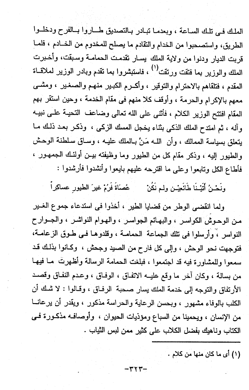 ولما انقضى الوطر من قضايا الطير أخذوا في استدعاء جموع الغير من الوحوش الكواسر والبهائم الجواسر والهوام النواشر والجوارح النواسر وأرسلوا في تلك الجماعة الحمامة وقلدوها فيه طوق الزعامة فتوجهت نحو الوحش وإلى كل فارح من الصيد وجحش وكانوا بذلك قد سمعوا وللمشاورة فيه قد اجتمعوا فبلغت الحمامة الرسالة وأظهرت ما فيها من بسالة وكان آخر ما وقع عليه الاتفاق الوفاق وعدم النفاق وقصد الارتقاء والتوجه إلى خدمة الملك يسار صحبة الرفاق وقالوا لا شك أن الكلب بالوفاء مشهور وبحسن الرعاية والحراسة مذكور ويقدر أن يرعانا من الإنسان ويجمينا من السباع ومؤذيات الحيوان وأوصافه مذكورة في الكتاب وناهيك بفضل الكلاب على كثير ممن لبس الثياب