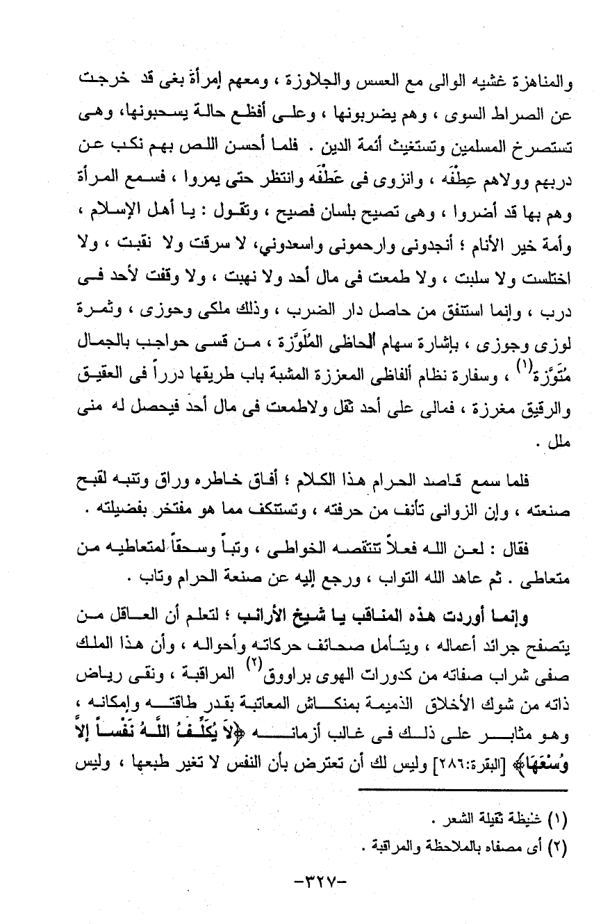 والمناهزة غشيه الوالي مع العسس والجلاوزه ومعهم امرأة بغى قد خرجت عن الصراط السوى وهم يضربونها وعلى أفظع حالة يسحبونها وهي تستصرخ المسلمين وتستغيث أئمة الدين فلما أحس اللص بهم نكب عن دربهم وولاهم عطفه ونزوى في عطفه وانتظر حتى يمروا فسمع المرأة وهم بها قد أضروا وهي تصيح بلسان فصيح وتقول يا أهل الإسلام وأمة خير الأنام أنجدوني وارحموني وأسعدوني لا سرقت ولا نقبت ولا اختلست ولا سلبت ولا ظمعت في مال أحد ولا نهبت ولا وقفت لأحد في درب وإنما استنفق من حاصل دار الضرب وذلك ملكي وحوزي وثمرة لوزي وجوزي باشارة سهام الحاظي الملوزة من قسى حواجب بالجمال متوزة وسفارة نظام الفاظي المعززة المشبه باب طريقها درراً في العقيق والرفيق مغرزه فما لي على أحد ولا طمعت في مال أحد فيحصل له منى ملل فلما سمع قاصد الحرام هذا الكلام أفاق خاطره وراق وتنبه لقبح صنعته وأن الزواني تانف من حرفته وتستنكف مما هو مفتخر بفضيلته فقال لعن الله فعلاً تنتقصه الخواطي وتباً وسحقاً لمتعاطيه من متعاطي ثم عاهد الله التواب ورجع إليه عن صنعة الحرام وتاب (وإنما أوردت) هذه المناقب يا شيخ الأرانب لتعلم أن العاقل من يتصفح جرائد أعماله ويتأمل صحائف حركاته وأحواله وأن هذا الملك صفى شراب صفاته من كدورات الهوى براورق للراقبة ونقى رياض ذاته من شوك الأخلاق الذميمة بمنكاش المعاتبة بقدر طاقته وإمكانه وهو مثابر على ذلك في غالب ازمانه ولا يكلف الله نفساً إلا وسعها وليس لك أن تعترض بان النفس لا تغير طبعها وليس