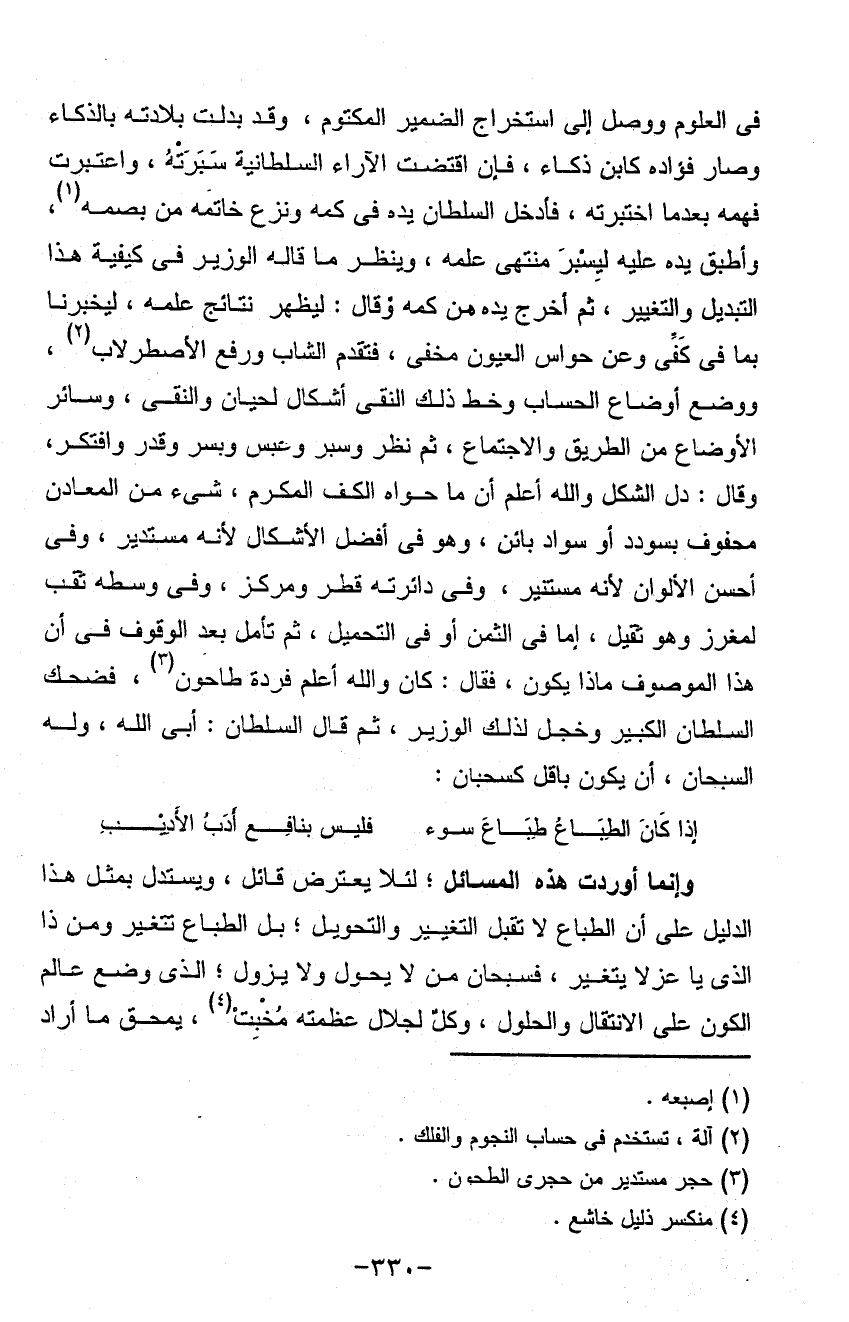 في العلوم ووصل إلى استخراج الضمير المكتوم وقد بدلت بلادته بالذكاء وصار فؤاده كابن ذكاء فان اقتضت الآراء السلطانية سبرته واعتبرت فهمه بعدما اختبرته فادخل السلطان يده في كمه ونزع خاتمه من بصمه وأطبق يده عليه ليسبر منتهى علمه وينظر ما قاله الوزير في كيفية هذا التبديل والتغيير ثم أخرج يده من كمه وقال ليظهر نتائج علمه ليخبرنا بما في كفي وعن حواس العيون مخفي فتقدم الشاب ورفع الإصطرلاب ووضع أوضاع الحساب وخط ذلك النقي أشكال لحيان والنقي وسائر الأوضاع من الطريق والاجتماع ثم نظر وسبر وعبس وبسر وقدر وافتكر وقال دل الشكل والله أعلم أن ما حواه الكف المكرم شيء من المعادن محفوف بسودد أسواد بائن وهو في أفضل الأشكال لأنه مستدير وفي أحسن الألوان لأنه مستنير وفي دائرته قطر ومركزه وفي وسطه ثقب لمغرز وهو ثقيل أما في الثمن أو في التحميل ثم تأمل بعد الوقوف في أن هذا الموصوف ماذا يكون فقال كان والله أعلم فردة طاحون فضحك السلطان الكبير وخجل لذلك الوزير ثم قال السلطان أبي والله وله السبحان أن يكون بأقل كسحبان: