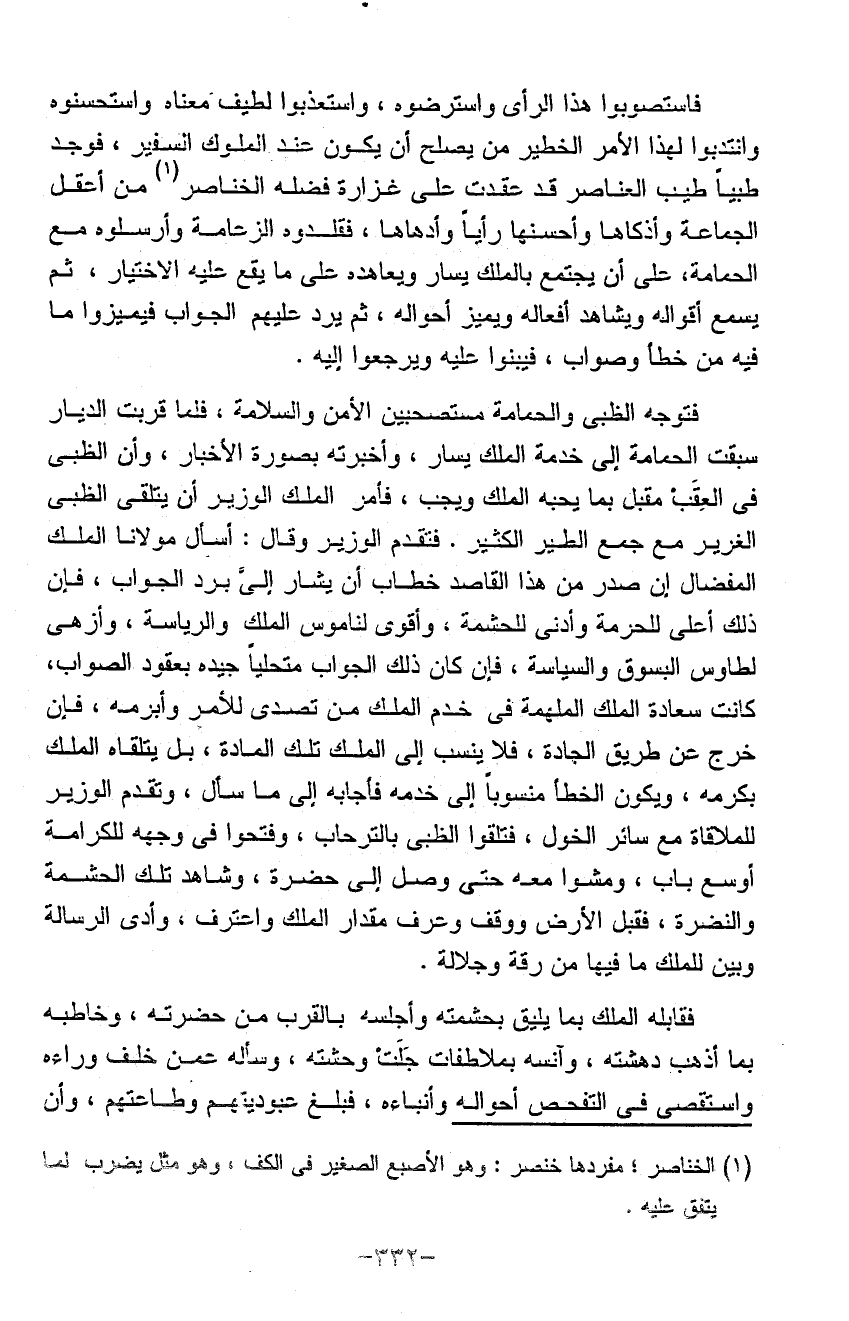 فاستصوبوا هذا الرأي واسترضوه واستعذبوا لطيف معناه واستحسنوه وانتدبوا لهذا الأمر الخطير من يصلح أن يكون عند الملوك السفير فوجدوا ظبياً طيب العناصر قد عقدت على غزارة فضله الخناصر من أعقل الجماعة وأذكاها وأحسنها رأياً وأدهاها فقلدوه الزعامة وأرسلوه مع الحمامة على أن يجتمع بالملك يسار ويعاهده على ما يقع عليه الاختيار ثم يسمع أقواله ويشاهد أفعاله ويميز أحواله ثم يرد عليهمالجواب فيميزوا ما فيه من خطا وصواب فيبينوا عليه ويرجعوا إليه فتوجه الظبي والحمامة مستصحبين الأمن السلامة فلما قربت الديار سبقت الحمامة إلى خدمة الملك يسار وأخبرته بصورة الأخبار وأن الظبي في العقب مقبل بما يحبه الملك ويجب فأمر الملك الوزير أن يتلقى الظبي الغرير مع جمع الطير الكثير فتقدم الوزير وقال أسأل مولانا الملك المفضال أن صدر من هذا القاصد خطاب أن يشار إلى برد الجواب فان ذلك أعلى للحرمة وأدنى للحشمة وأقوى لناموس الملك والرياسة وأزهى لطاوس البسوق والسياسة فان كان ذلك الجواب متحلياً جيده بعقود الصواب كانت سعادة الملك الملهمة وفي خدم الملك من تصدى للأمر وأبرمه فان خرج عن طريق الجادة فلا ينسب إلى الملك تلك المادة بل يتلقاه الملك بكرسه ويكون الخطأ منسوباً إلى خدمه فأجابه إلى ما سأل وتقدم الوزير للملاقاة مع سائر الخول فتلقوا الظبي بالترحاب وفتحوا في وجهه للكرامة أوسع باب ومشوا معه حتى وصل إلى الحضرة وشاهد تلك الحشمة والنضرة فقبل الأرض ووقف وعرف مقدار الملك وأعترف وأدى الرسالة وبين للملك ما فيها من رقة وجلاله فقابله الملك بما يليق بحشمته وأجلسه بالقرب من حضرته وخاطبه بما أذهب دهشته وآنسه بملاطفات جلت وحشته وسأله عمن خلف وراءه واستقصى في التفحص أحواله وأنباءه فبلغ عبوديتهم وطاعتهم وأن