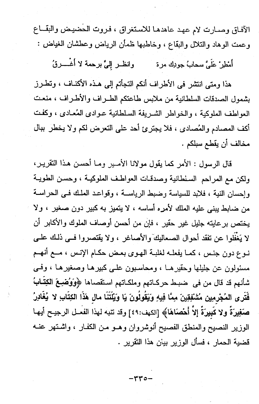 هذا ومتى انتشر في الأطراف أنكم التجأتم إلى هذه الأكناف وتطرز بشمول الصدقات السلطانية من ملابس طاعتكم الطراف والأطراف منعت العواطف الملوكية والخواطر الشريفة السلطانية عوادي المعادي وكفت أكف المصادم والمصادي فلا يجترئ أحد على التعرض لكم ولا يخطر ببال مخالف أن يقطع سبلكم قال الرسول الأمر كما يقول مولانا الأمير وما أحسن هذا التقرير ولكن مع المراحم السلطانية وصدقات العواطف الملوكية وحسن الطوية وإحسان النية فلا بد للسياسة وضبط الرياسة وقواعد الملك في الحراسة من ضابط يبني عليه الملك لأمره أساسه لا يتميز به كبير دون صغير ولا يختص برعايته جليل غير حقير فان من أحسن أوصاف الملوك والأكابر أن لا يغفلوا عن تفقد أحوال الصعاليك والأصاغر ولا يقتصر وافي ذلك على نوع دون جنس كما يفعله لغلبة الهوى بعض حكام الأنس مع أنهم مسؤلون عن جليلها وحقيرها ومحاسبون على كبيرها وصغيرها وفي شأنهم قد قال من في ضبط حركاتهم وملكاتهم استقصاها ووضع الكتاب فترى المجرمين مشفقين مما فيه ويقولون يا ويلتنا ما لهذا الكتاب لا يغادر صغيرة ولا كبيرة إلا أحصاها وقد تنبه لهذا الفعل الرجيح أيها الوزير النصيح والمنطق الفصيح أنوشروان وهو من الكفار واشتهر عنه قضية الحمار فسال الوزير بيان هذا التقرير