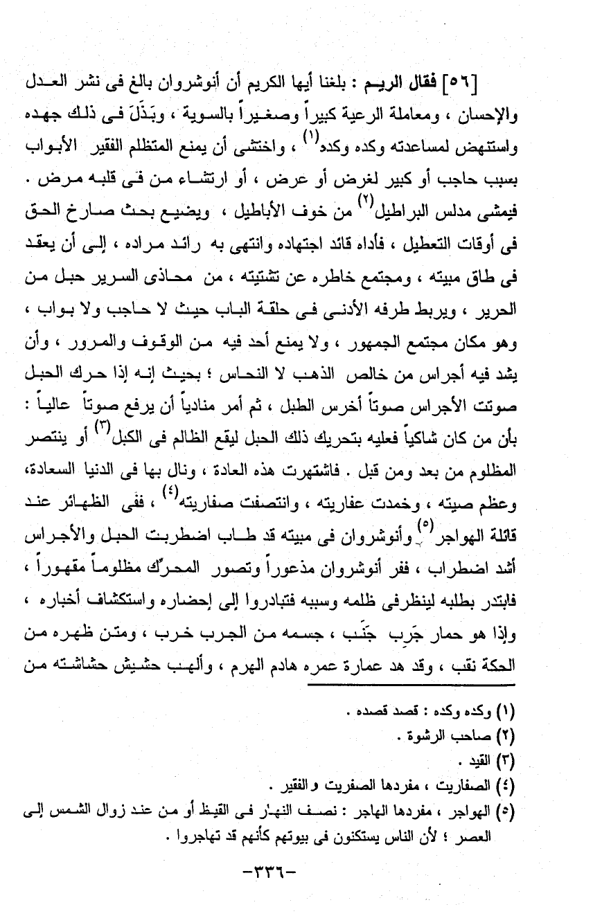 (فقال) الريم بلغنا أيها الكريم أن أنوشروان بالغ في نشر العدل والإحسان ومعاملة الرعية كبيراً وصغيراً بالسوية وبذلك في ذلك جهده واستنهض لمساعدته وكده وكده واختشى أن يمنع المتظلم الفقير الأبواب بسبب حاجب أو كبير لغرض أو عرض أو ارتشاء من في قلبه مرض فيمشي مدلس البراطيل من خوف الأباطيل ويضيع بحث صارخ الحق في أوقات التعطيل فاداه قائداً اجتهاده وانتهى به رائد مراده إلى أن يعقد في طاق مبيته ومجتمع خاطره عن تشتيته من محاذي السرير حبل من الحرير ويربط طرفه الأدنى في حلقة الباب حيث لا حاجب ولا بواب وهو مكان مجتمع الجمهور ولا يمنع أحد فيه من الوقوف والمرور وأن ينشد فيه أجراس من خالص الذهب لا النخاس بحيث إنه إذا حرك الحبل صوتت الأجراس صوتاً أخرس الطبل ثم أمر منادياً أن يرفع صوتاً عالياً بان من كان شاكاً فعليه بتحريك ذلك الحبل ليقع الظالم في الكبل أو ينتصر المظلوم من بعد ومن قبل فاشتهرت هذه العادة ونال بها في الدنيا السعادة وعظم صيته وخمدت عفاريته وانتصف صفاريته ففي بعض الظهائر عند قائلة الهواجر وأنوشروان في مبيته قد طاب اضطربت الحبل والأجراس أشد اضطراب ففز أنوشروان مذعوراً وتصور المحرك مظلوماً مقهوراً فابتدر بطلبه لينظر في ظلمه وسببه فتبادروا إلى إحضاره واستكشاف أخباره وإذا هو حمار حرب جنب جسمه من الجرب خرب ومتن ظهره من الحكة نقب وقد هد عمارة عمره هادم الهرم وألهت حشيش حشاشته من